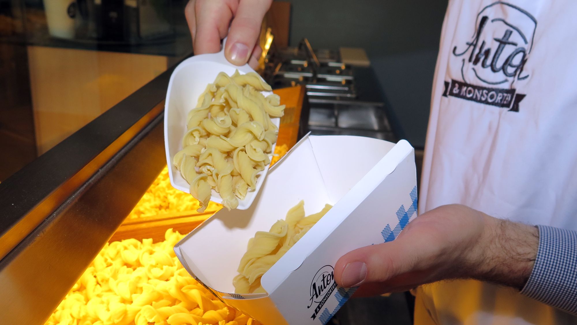 Vier verschiedene Formen gibt es in dem kleinen Imbiss mit dem Namen „Anton und Konsorten“ – Mafaldine, Fussili, Torchetti und Conchiglie. Es gibt Weizenmehlnudeln oder solche aus Vollkorn-Dinkel-Gries. Und gelegentlich auch rote (mit Tomatenmark) oder grüne (mit Spinatpulver).