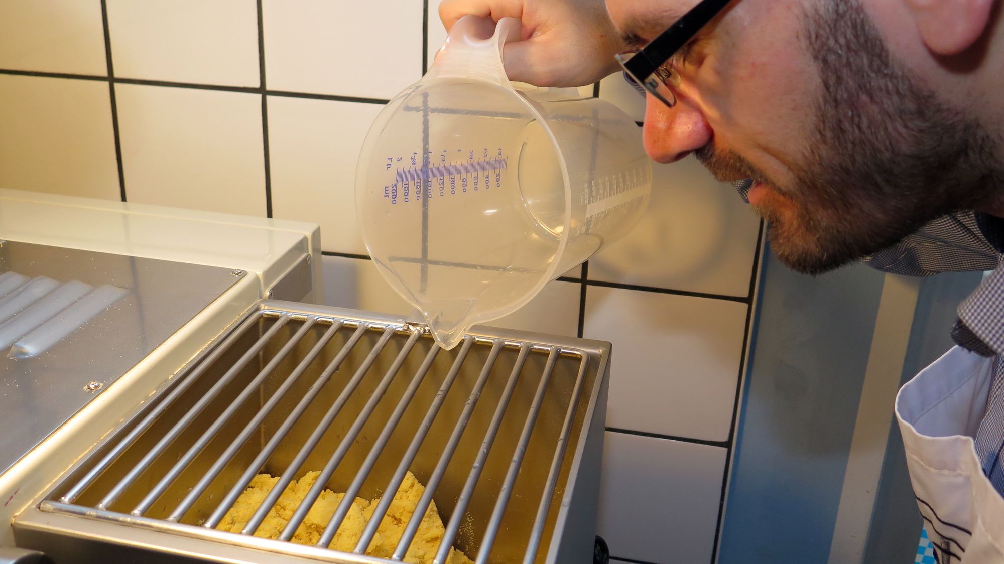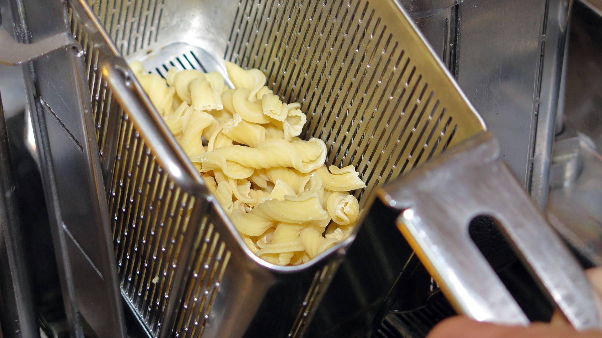 Fred nimmt eine in die Hand, der geformte Nudel-Teig ist noch ganz weich. Die frischen Nudeln brauchen nun nur 1.45 Minuten bei 98 Grad. „Bei uns werden sie nicht gekocht, nur gesiedet“, erklärt Fred. Danach sind sie schön bissfest „Al dente“ würde der Italiener sagen. Durch die kurze Siedezeit bleiben mehr Vitamine erhalten, die Nudeln schmecken frischer, vor allem aber geht es so richtig schnell. „Bei uns muss niemand länger als fünf Minuten auf sein Essen warten“, sagt Fred. Gerade im Mittagsgeschäft ist das wichtig.
