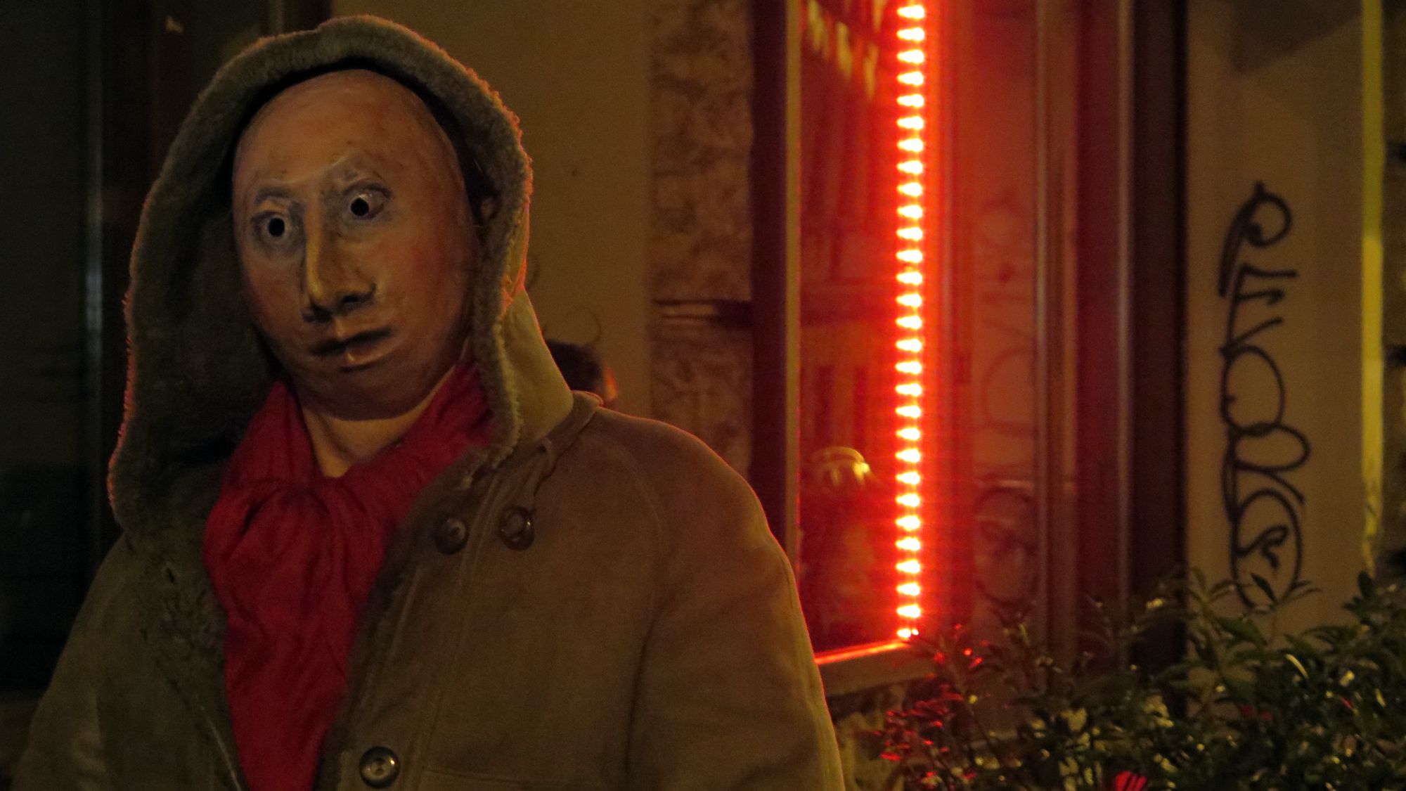 Ich reiße mich los, springe über die Kette, stehe auf der Straße, herannahende Autos scheinen mir ungefährlich im Vergleich zu diesen Fratzen. Dann flammt ein Licht auf, eine Kamera blitzt in die Nacht, jemand lacht. Ich trete ein paar Schritte zurück und verfolge die Szenerie von der anderen Straßenseite. Etwa zehn bis zwanzig Personen haben sich teils in Kostüme gehüllt, alle tragen sie Masken. Manche schrill und bunt, einige hautfarben und erschreckend lebensnah und doch so unglaublich starr.