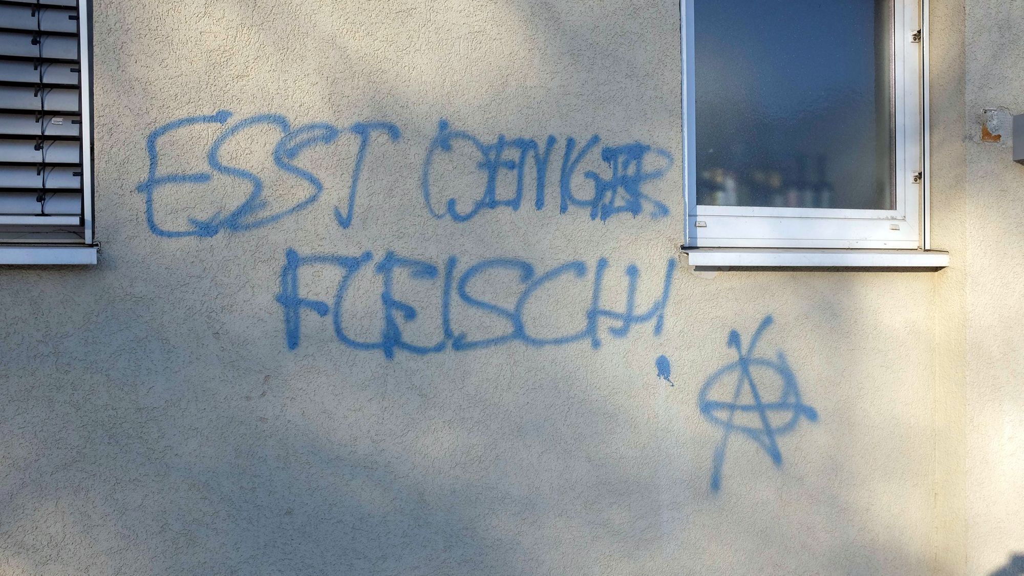 Von außen sieht das Gebäude nicht so einladend aus, außerdem hat jemand eine Botschaft untergebracht: „Esst weniger Fleisch“. Ich habe mir einen adretten Begleiter gesucht und will mich von diesem Spruch und der Fassade nicht schrecken lassen. Steffen Zuber begrüßt uns mit einer riesigen Flasche Wein in der Hand „Großes Gewächs“ – nein, nach Wein steht mir gerade nicht der Sinn, wir wollen Mittagstisch und suchen uns ein gemütliches Tischchen.