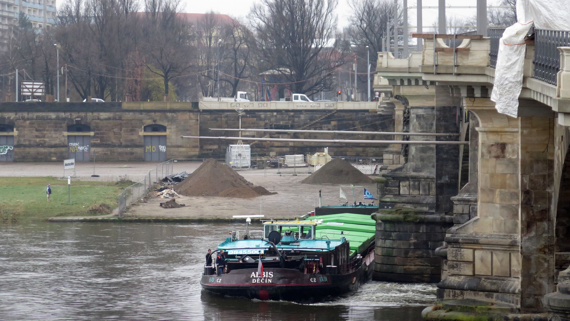 Das tschechische Großmotorgüterschiff „Albis“ liegt schon seit Montag Abend vor der Albertbrücke. Er blockiert insgesamt drei Brückenbögen. Der nördlichste Brückenbogen ist zwar noch frei, aber durch die Stauwirkung strömt das Wasser dort inzwischen ziemlich stark. Daher ist die Elbe zurzeit für den Schiffsverkehr gesperrt. Die Ursache ist noch unklar.
