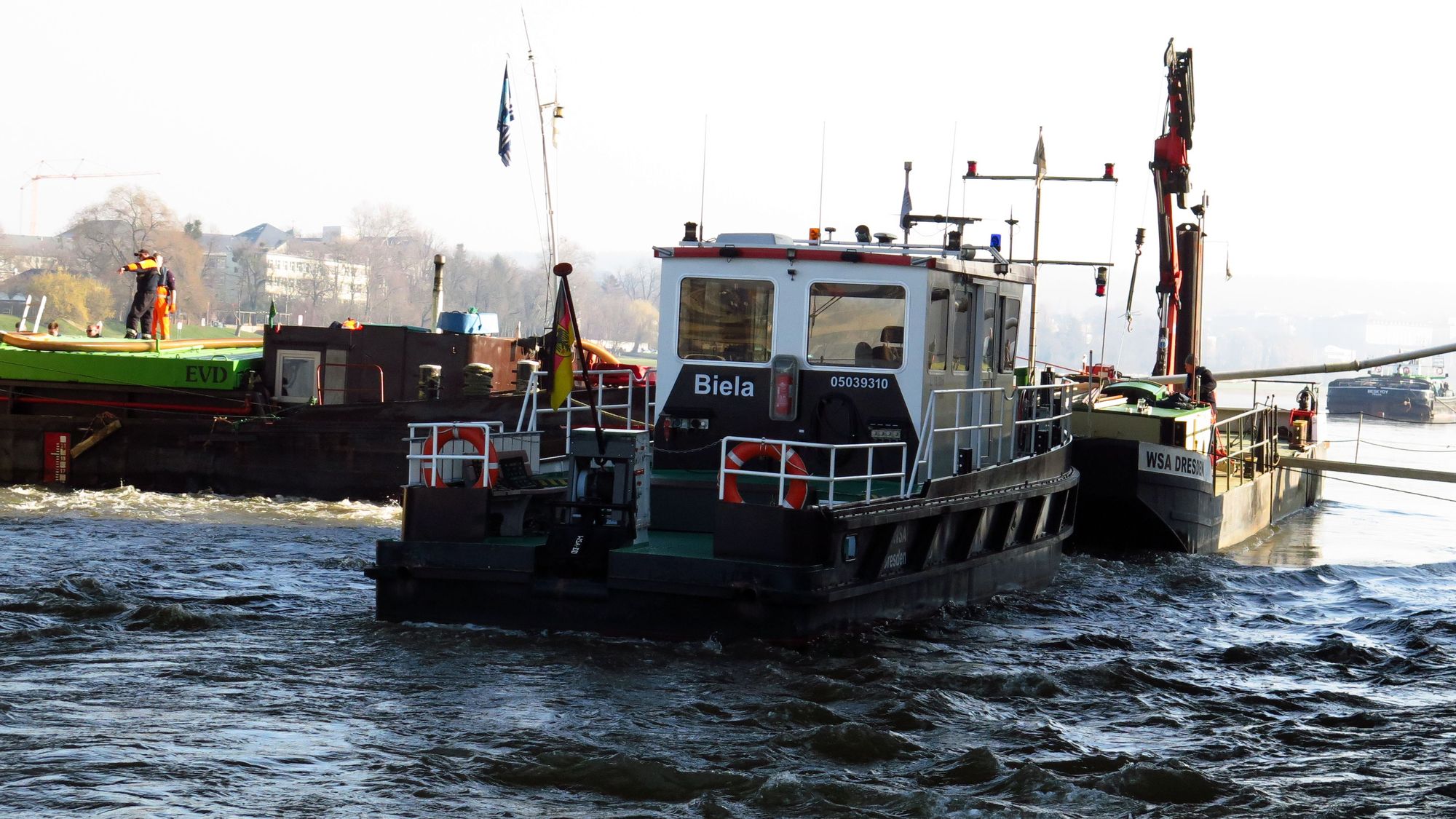 Auch am dritten Morgen liegt die tschechische „Albis“ noch nahezu unverändert an der Albertbrücke. Das Abpumpen des Salzes mit einem Saugbagger ist misslungen. Der Frachter wird wieder durch ein Schubschiff stabilisiert.