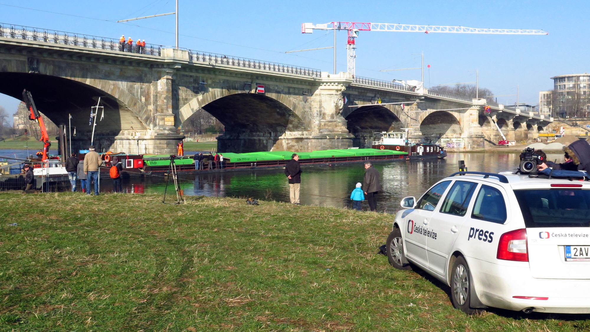 Während der Elbpegel seit der Havarie am Montag Abend um etwa 20 Zentimeter gesunken ist, steigt der Andrang am Ufer. Neben semiprofessionellen Frachter-Spottern war heute auch das tschechische Fernsehen anwesend und versuchte bewegte Bilder einer Bergungsaktion einzufangen. Doch am Schiff passiert effektiv im Moment so gut wie nichts.
