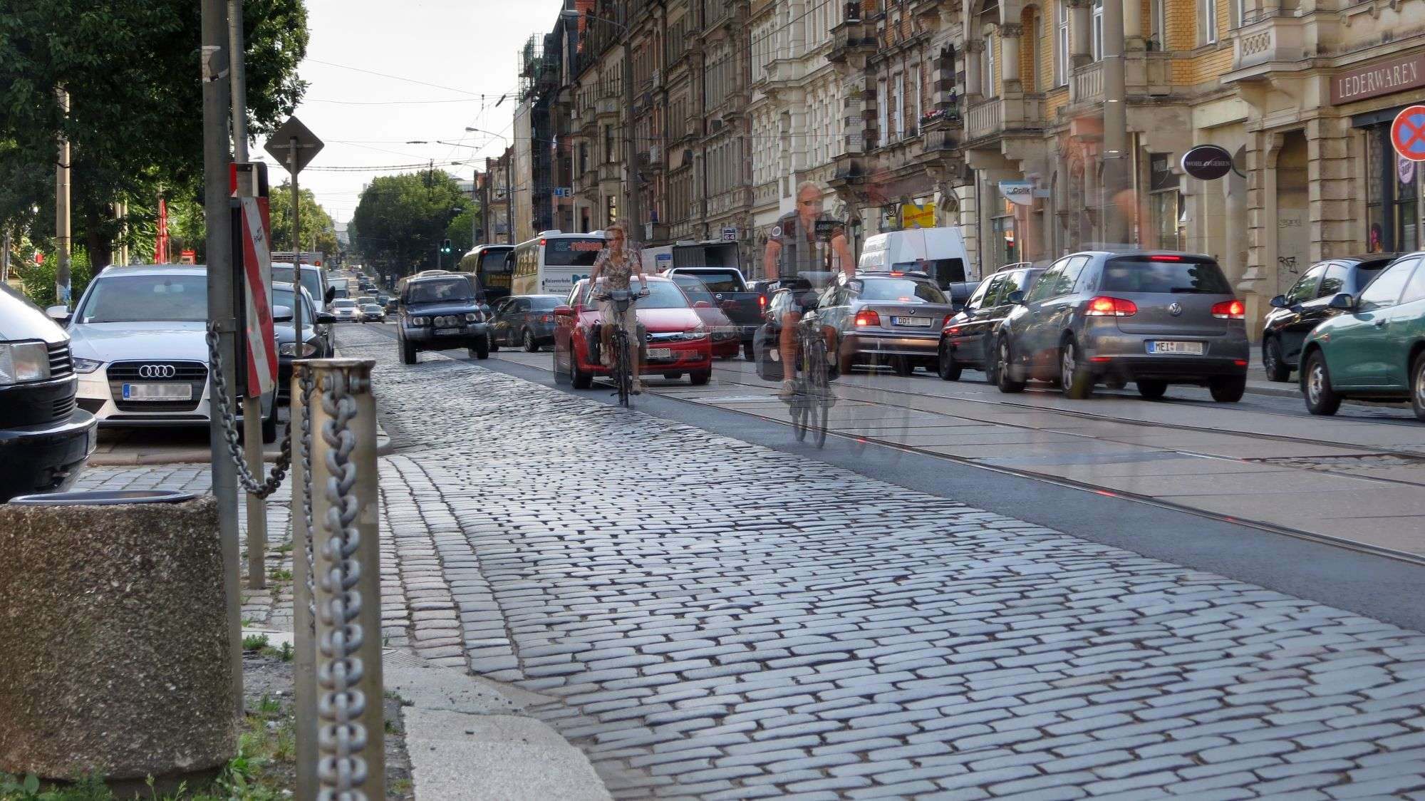 Danach kann man sich durch die Blechlawine schlängeln. Schwierig für alle, die eben noch schnell die Straßenbahn erreichen wollen. In den verkehrsärmeren Zeiten ist es wichtig, die Geschwindigkeit der Fahrzeuge genau einzuschätzen. Denn gerade in den Abendstunden prescht hier so mancher mit tödlicher Geschwindigkeit übers Pflaster.