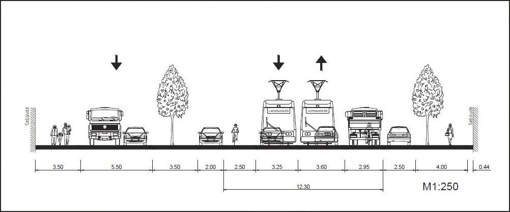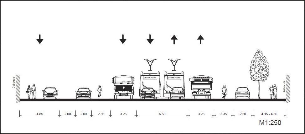 6,50 Meter für die Straßenbahn, 13 Meter für die fahrenden Autos, 6,50 Meter für die parkenden Autos, 6 Meter für die Radfahrer und 9 Meter für die Fußgänger. Summe: 41 Meter von Haus bis Haus. Da müssen wir zwischen Bischofsweg und Louisenstraße wohl irgendwas abreißen.