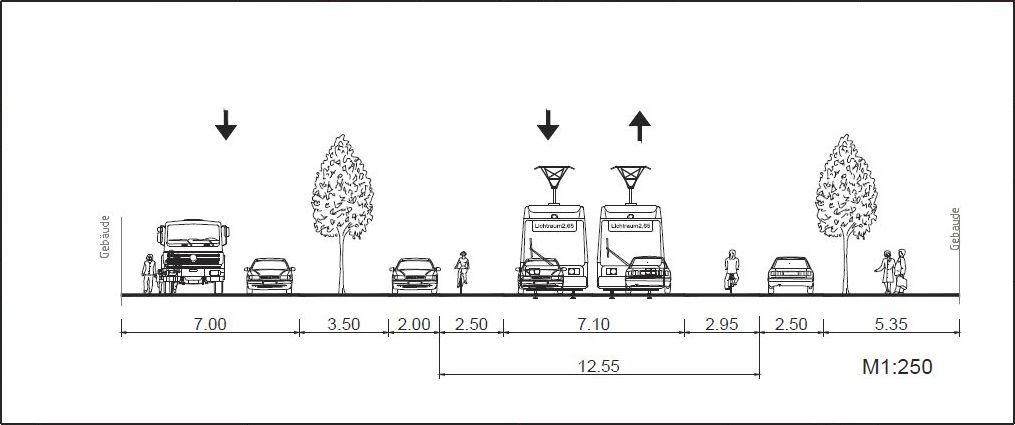 Schau lieber auf die Antonstraße, die ist für Kfz und Straßenbahn identisch breit wie Variante 7 und hat einen völlig anderen Charakter.