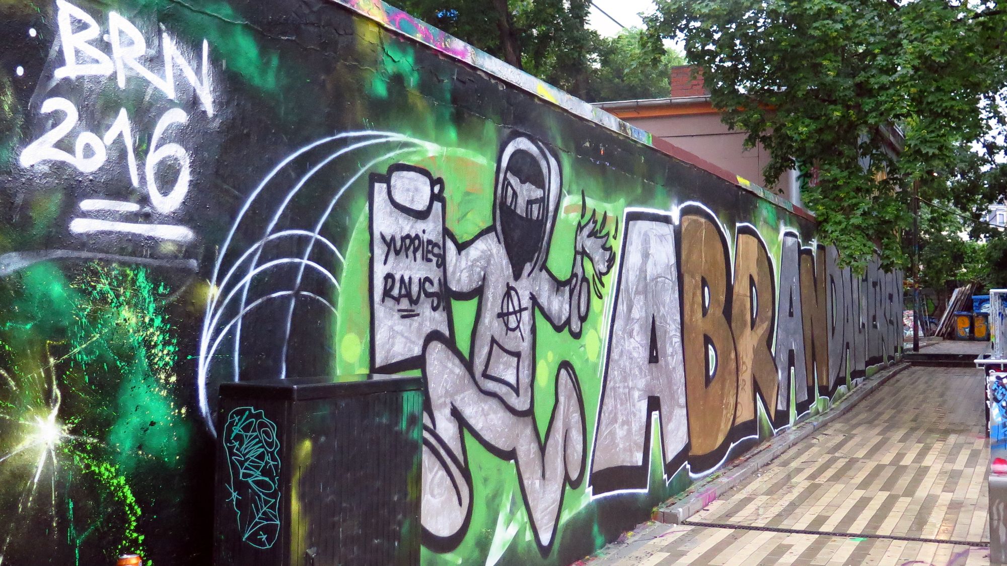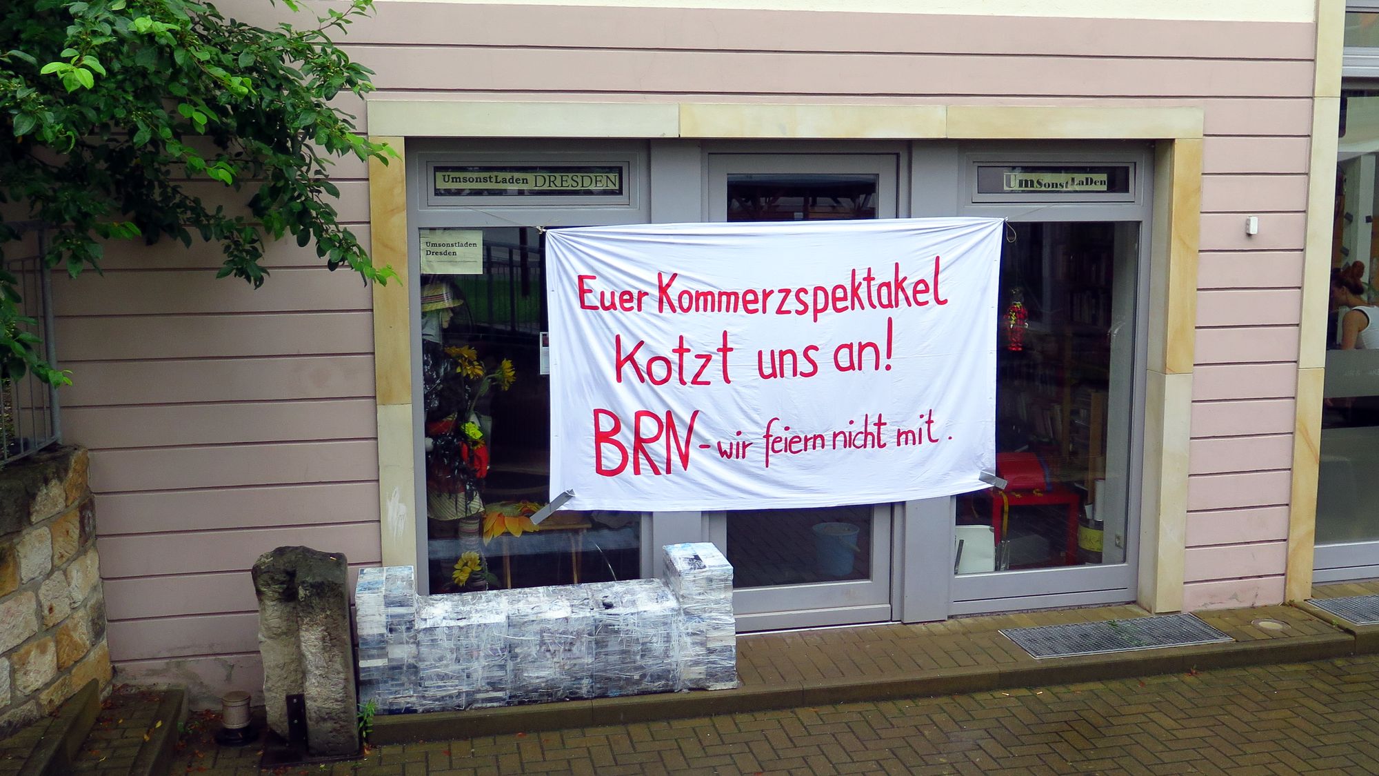 Umsonstladen im SonnenhofEinige Anwohner zeigen mit Transparenten, was sie von der BRN halten, nämlich gar nix. „Scheiß Verein“ tönt es auf der Louisenstraße, „FCK BRN“ von der Alaunstraße. Und nun schon fast traditionell protestiert auch der Umsonstladen gegen das, was aus der Bunten Republik geworden ist. Eine Gruppe namens „Asoziales Netzwerk“ fordert in einem Video, dass die BRN, so wie sie jetzt veranstaltet wird, den Namen nicht mehr tragen soll.Abrandalieren! Gesprühtes Statement zur BRN an Katys Garage.