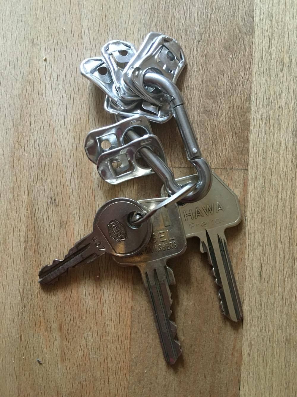 Am Bund sind 5 Schlüssel, 2 große und 3 kleine. Ein Metalbuchstabe „ S“ sowie eine Ledercordelschlaufe.
