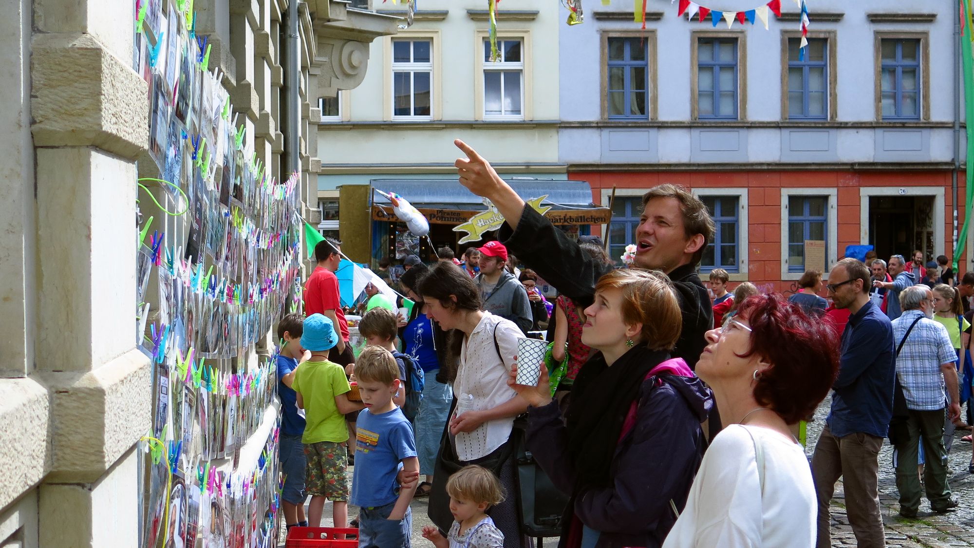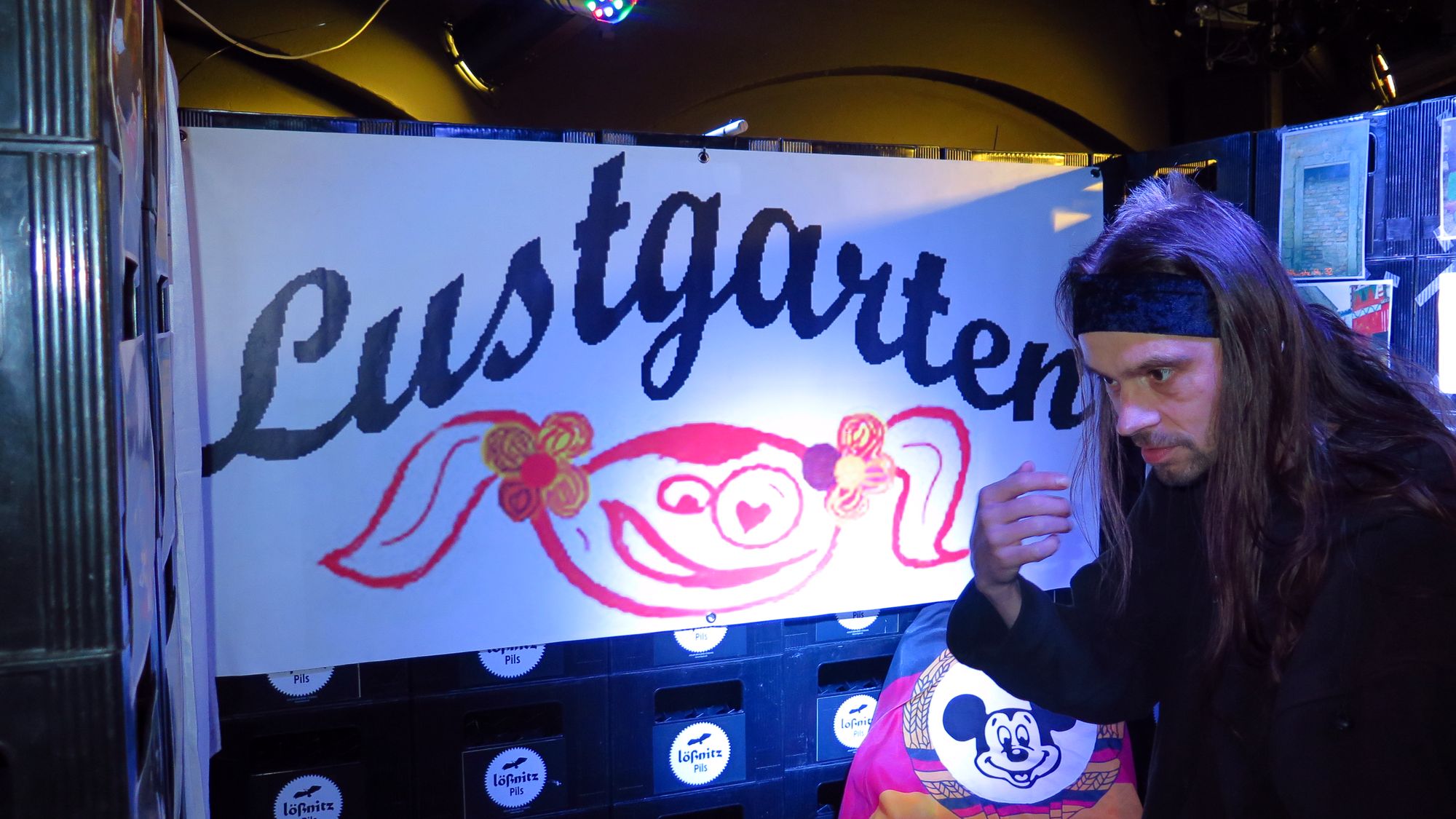 Mirko Sennewald begutachtet seinen Lustgarten im BRN-MuseumIch flüchte aus der Vergangenheit und stürze mich ins nachmittägliche BRN-Getümmel. Der Sonnenschein hat die Regentropfen übertrumpft, an allen Ecken erklingt Musik, am Martin-Luther-Platz locken Pelmeni. Da am Sonntag keine Anker mehr spielen, muss ich damit auch nicht warten. Am südlichen Ende der Martin-Luther-Straße schaue ich in den versteckten Hinterhof. Morgen Nachmittag gibts hier „Marmitako“, ein dickes Kreuz in den Veranstaltungskalender.