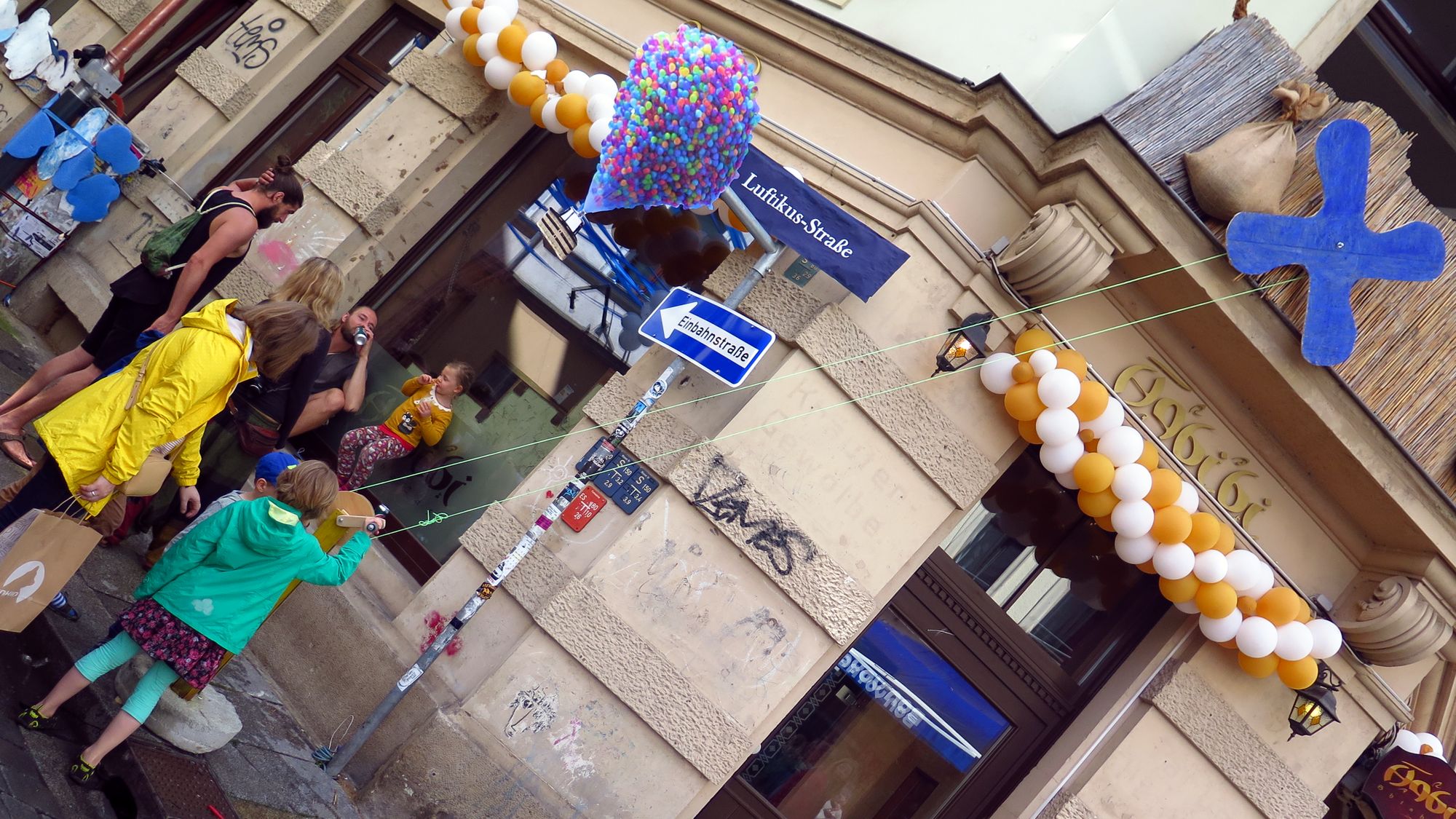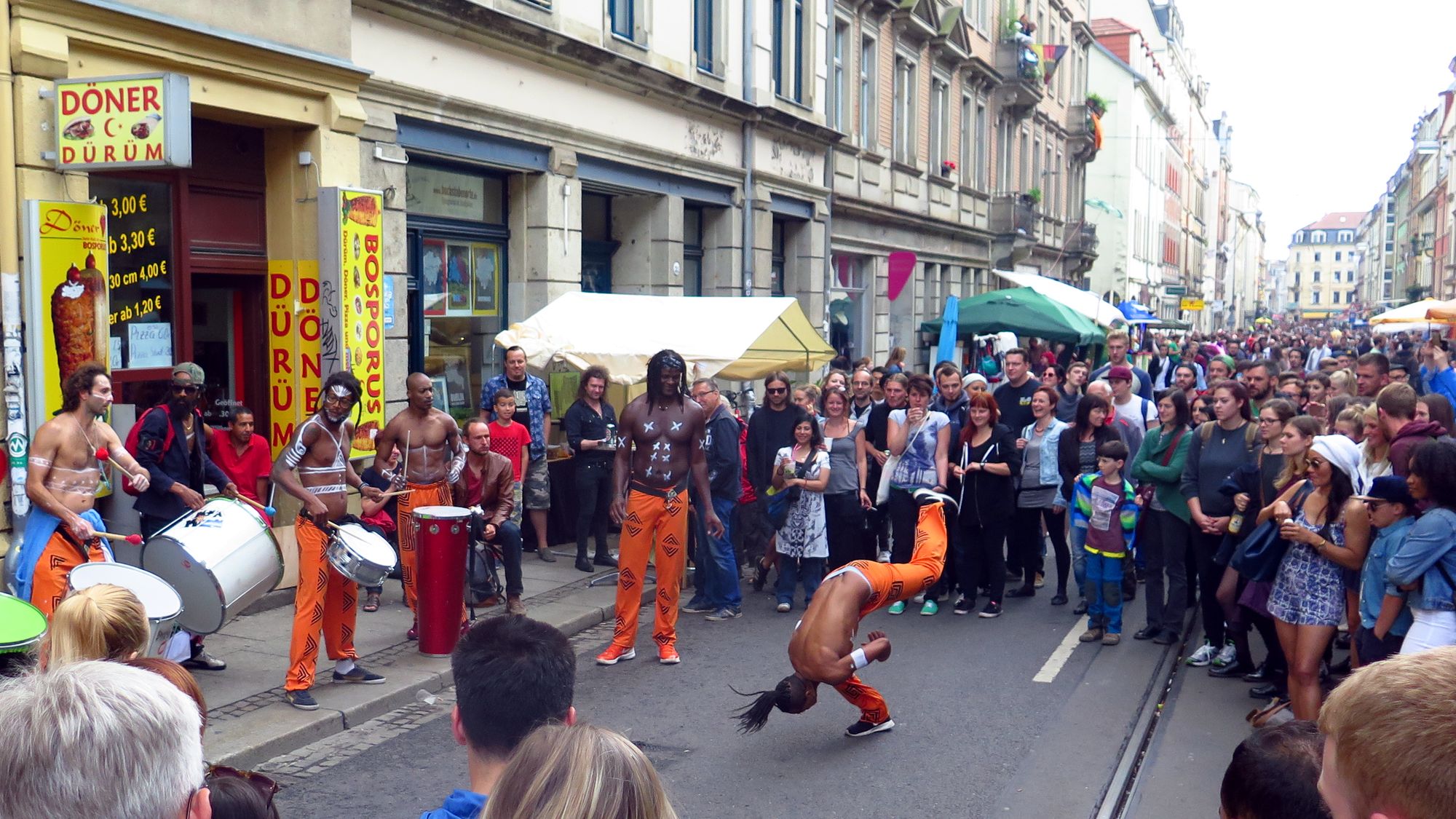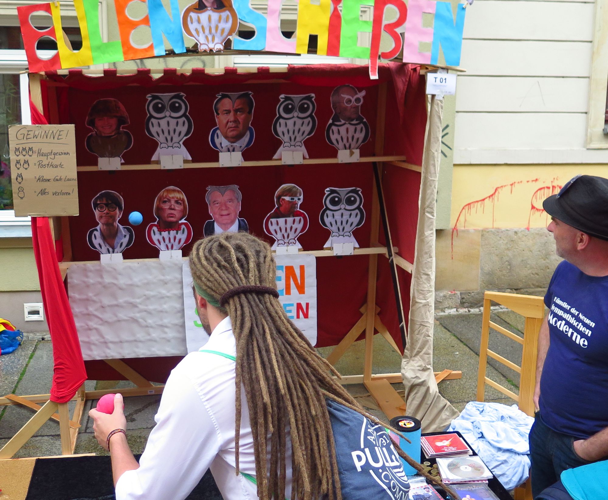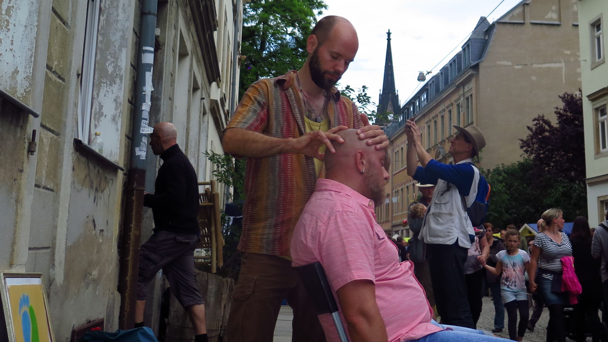 Heavy Metal vorm Heavy DutyZurück über die Böhmische hin zur Alaunstraße, Volksfest-BRN, alle lächeln, alle freundlich, auch der Trunkenbold, der sich provokativ mitten auf die Alaunstraße gesetzt hat, wird geschickt umrundet. Und bei Bethe kauft keiner Fettbemmchen. Vorm Heavy Duty gibt’s Heavy Metal und Rocker in mitgebrachten Angel-Sesseln. Schön gemütlich hier. Weiter geht’s über die Alaunstraße. Teenager mit Rummelplatz-Luftballons und Softdrinks. Alle freundlich, super. Sun overshines on BRN oder so ähnlich. Auf dem Alaunplatz wird gekubbt und ein Vorzeige-Punker läuft vor mir her. Yeah. Dann ein bisschen Rebellion. Im Hostel spielt die Band von drinnen nach draußen. Eine Bühne bekam Lollies in der Nähe ja nicht genehmigt. Jetzt wirds mir zu wild, ich verlasse diesen Ort, um wenig später an der Talstraße in Tiefenmeditation zu versinken. Meditation auf der Talstraße