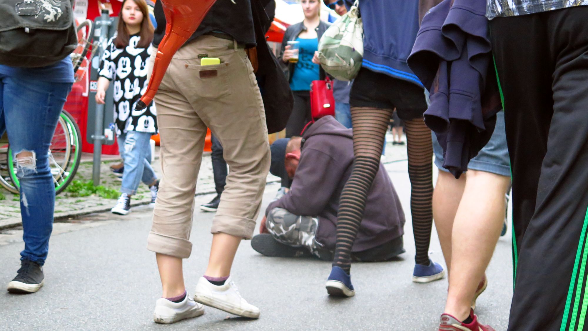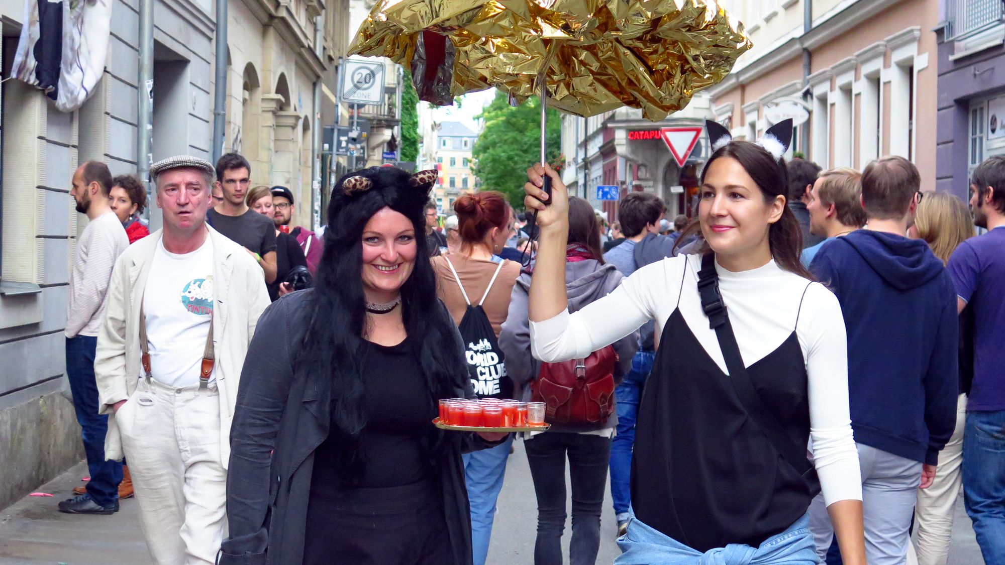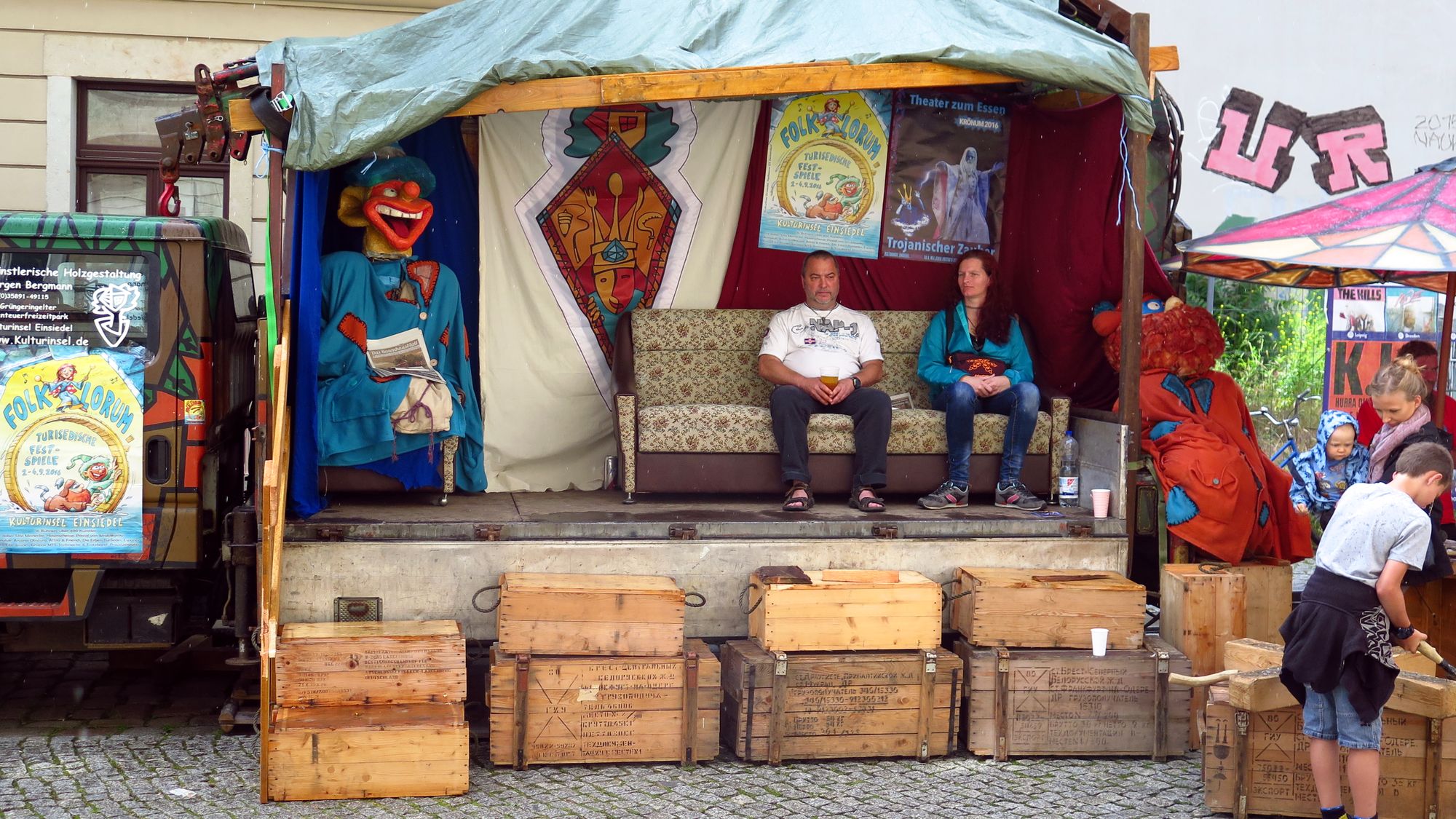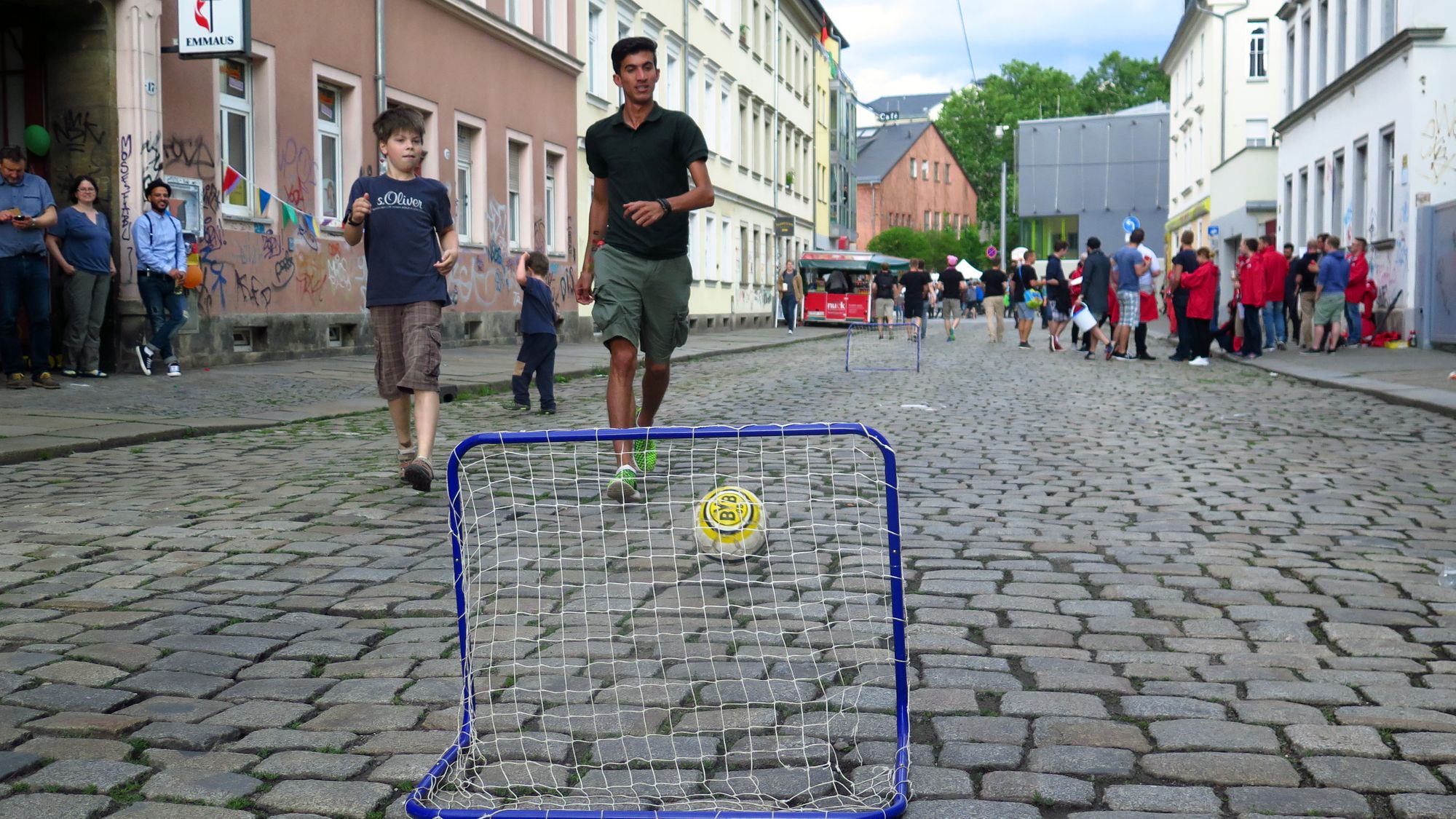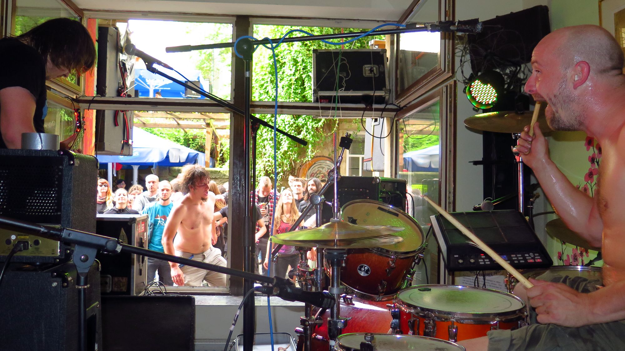 Heavy Metal vorm Heavy DutyZurück über die Böhmische hin zur Alaunstraße, Volksfest-BRN, alle lächeln, alle freundlich, auch der Trunkenbold, der sich provokativ mitten auf die Alaunstraße gesetzt hat, wird geschickt umrundet. Und bei Bethe kauft keiner Fettbemmchen. Vorm Heavy Duty gibt’s Heavy Metal und Rocker in mitgebrachten Angel-Sesseln. Schön gemütlich hier. Weiter geht’s über die Alaunstraße. Teenager mit Rummelplatz-Luftballons und Softdrinks. Alle freundlich, super. Sun overshines on BRN oder so ähnlich. Auf dem Alaunplatz wird gekubbt und ein Vorzeige-Punker läuft vor mir her. Yeah. Dann ein bisschen Rebellion. Im Hostel spielt die Band von drinnen nach draußen. Eine Bühne bekam Lollies in der Nähe ja nicht genehmigt. Jetzt wirds mir zu wild, ich verlasse diesen Ort, um wenig später an der Talstraße in Tiefenmeditation zu versinken. Meditation auf der Talstraße