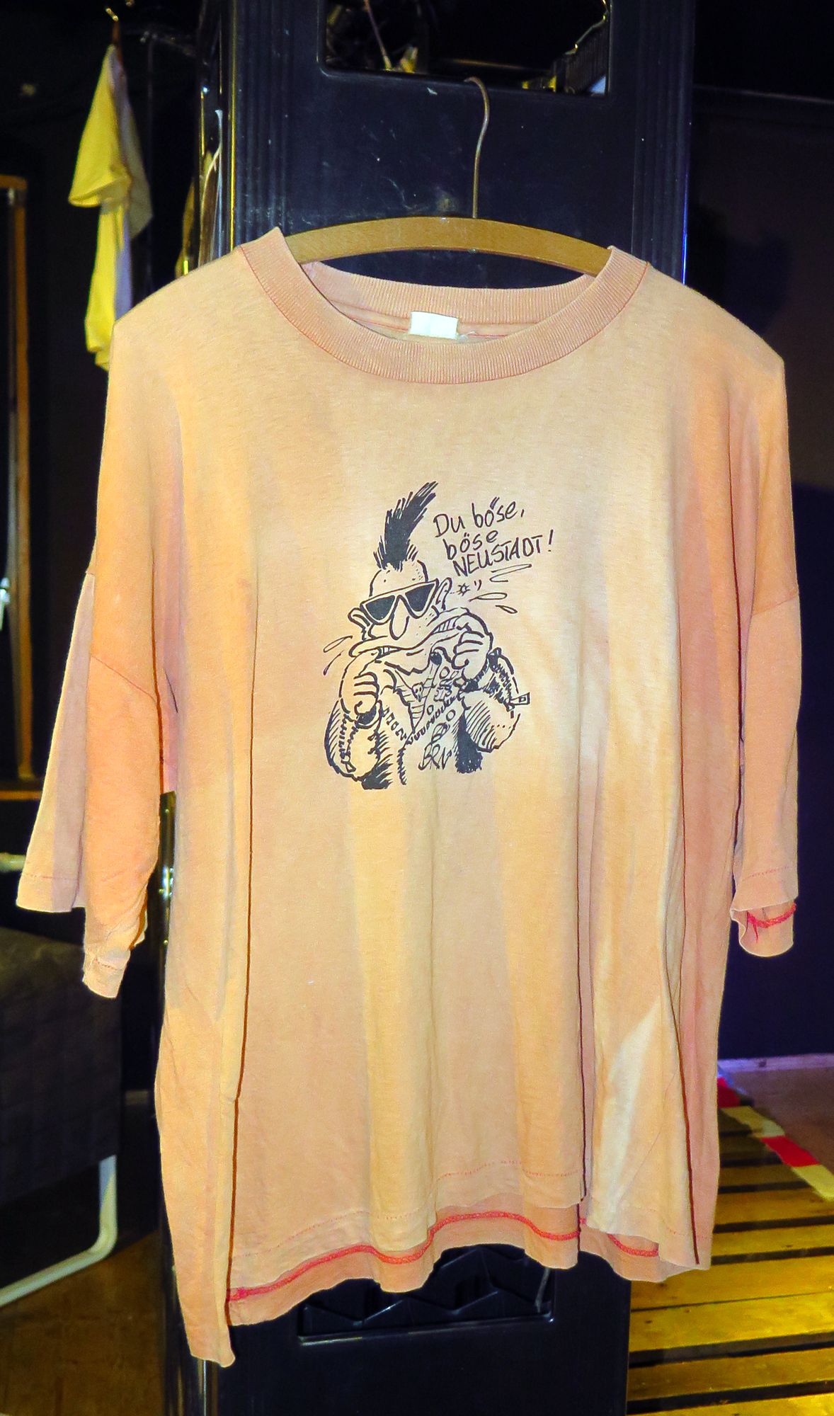 Und sonst so? Nachdem ich es gestern nicht geschafft hatte, hab ich mir heute das BRN-Museum vorgeknöpft. Treffe dort Mirko Sennewald, der seinen BRN-Lustgarten nun nur noch im Museum bestaunen kann. Ob es nächstes Jahr wieder wird, steht in den Sternen. Eine aufgeräumte Schwafelrunden-Ulla führt mich durch das Bierkasten-Labyrinth. Spätestens beim ausgeblichenen „böse Neustadt-T-Shirt“ wird mir ganz erinnerungstaumelig. In der gleichen Farbe hatte ich das vor nem knappen Vierteljahrhundert auch mal erworben. Das hat aber längst den Weg in die Textilzerfaserung gefunden.