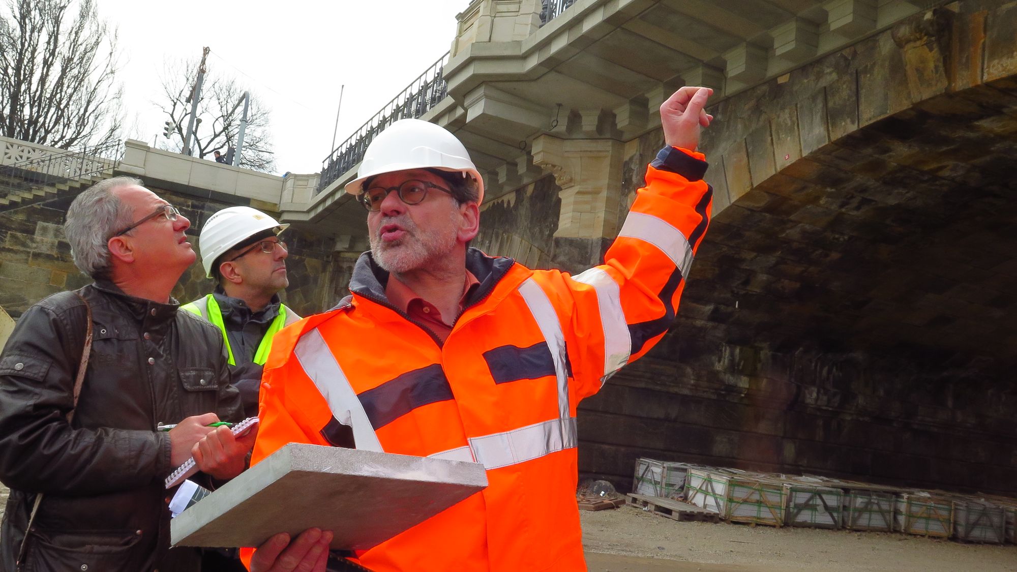 Auch die Brückenkappen als seitlicher Abschluss des Überbaus seien fertig gestellt, heißt es in einer Mitteilung der Stadtverwaltung. Nun gehe die Montage der Sandsteinbrüstungen auf der Unterstromseite zügig weiter. Bereits seit 20. Juni werde am Brückengeländer gearbeitet. Zuerst muss das erhöhte Geländer montiert, später dann das historische Geländer ergänzt werden. Das wird bereits im Werk vormontiert und ab 4. Juli eingebaut.