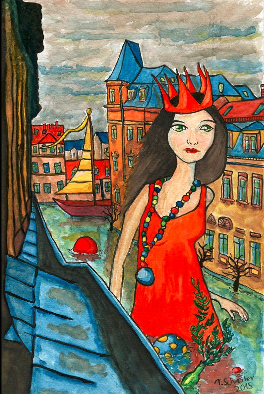 „Großstadtträume“ Aquarell von Thomas Schreiter – ausgestellt im „Lose“ auf der Böhmischen StraßeMit der Frau habe er sich leicht getan, die ist seiner Phantasie entsprungen, aber gerade mit der Frauenkirche im Hintergrund, da müsste jeder Fleck im Gemäuer stimmen. Deshalb gleicht er immer wieder ab. Ein solch farbgewaltiges Werk hatte ich hier gar nicht erwartet. Neugierig geworden war ich durch ein Bildchen im „Lose“ auf der Böhmischen Straße, dass einen Neustädter Straßenzug zeigt, jedoch mit riesigem Mädchen und statt Straße ein Wassergraben. Von diesen Straßen-Motiven hat er noch mehr, eines gibt es schon als Postkarte, ein Geschenke-Händler zeigte sich spontan sehr interessiert.