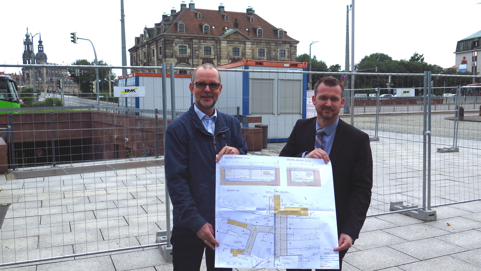 Abteilungsleiter Gunther Hentschelmann und Baubürgermeister Raoul Schmidt-LamontainDie Plätze um die Eingänge herum werden entsprechend ihrer Umgebung gestaltet. Am Neustädter Markt werden das Granitplatten sein. Auf der anderen Seite, bleibt die berühmte Skater-Rampe erstmal erhalten. Der Tunnel wird dort einfach zugemauert. Schmidt-Lamontain erklärt: „Da die künftige Gestaltung an der Augustusbrücke noch nicht geklärt ist, wird es diese vorübergehende Lösung geben.“