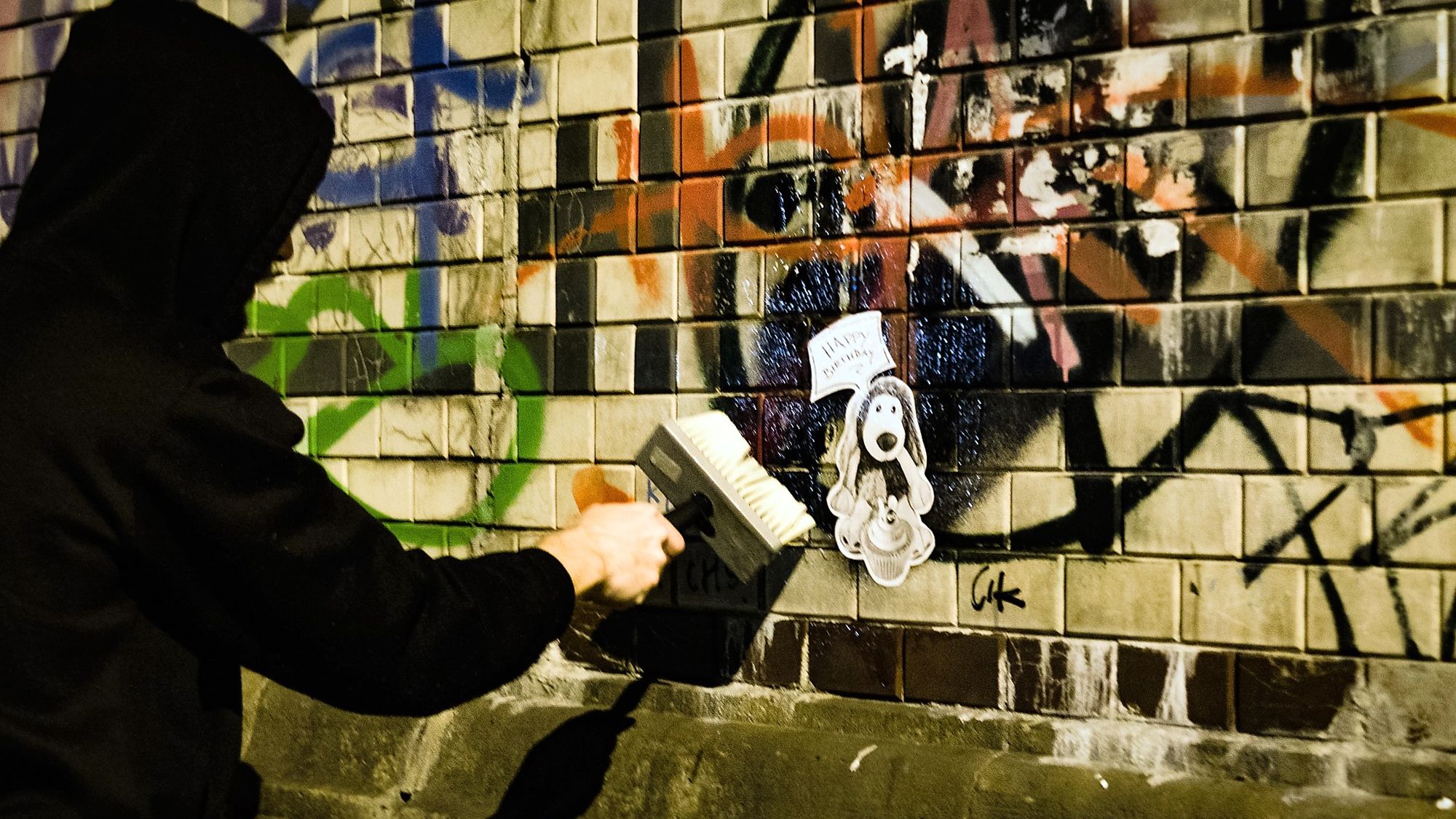 Gestern im Copyshop. Ein junger Mann steht mit ’nem riesigen Kuscheltier neben einem Kopierer. Ist der nicht ein bisschen alt für diese Art Schlafbegleiter? Später wird er sich eine Kaputze überziehen und kriminellen Machenschaften nachgehen. Mit Kleber und Pinsel ausgestattet, sucht er sich eine Mauer in einer dunklen Gasse, zückt den Pinsel, schmiert den Leim an die Wand und pappt ein Poster an die Wand.