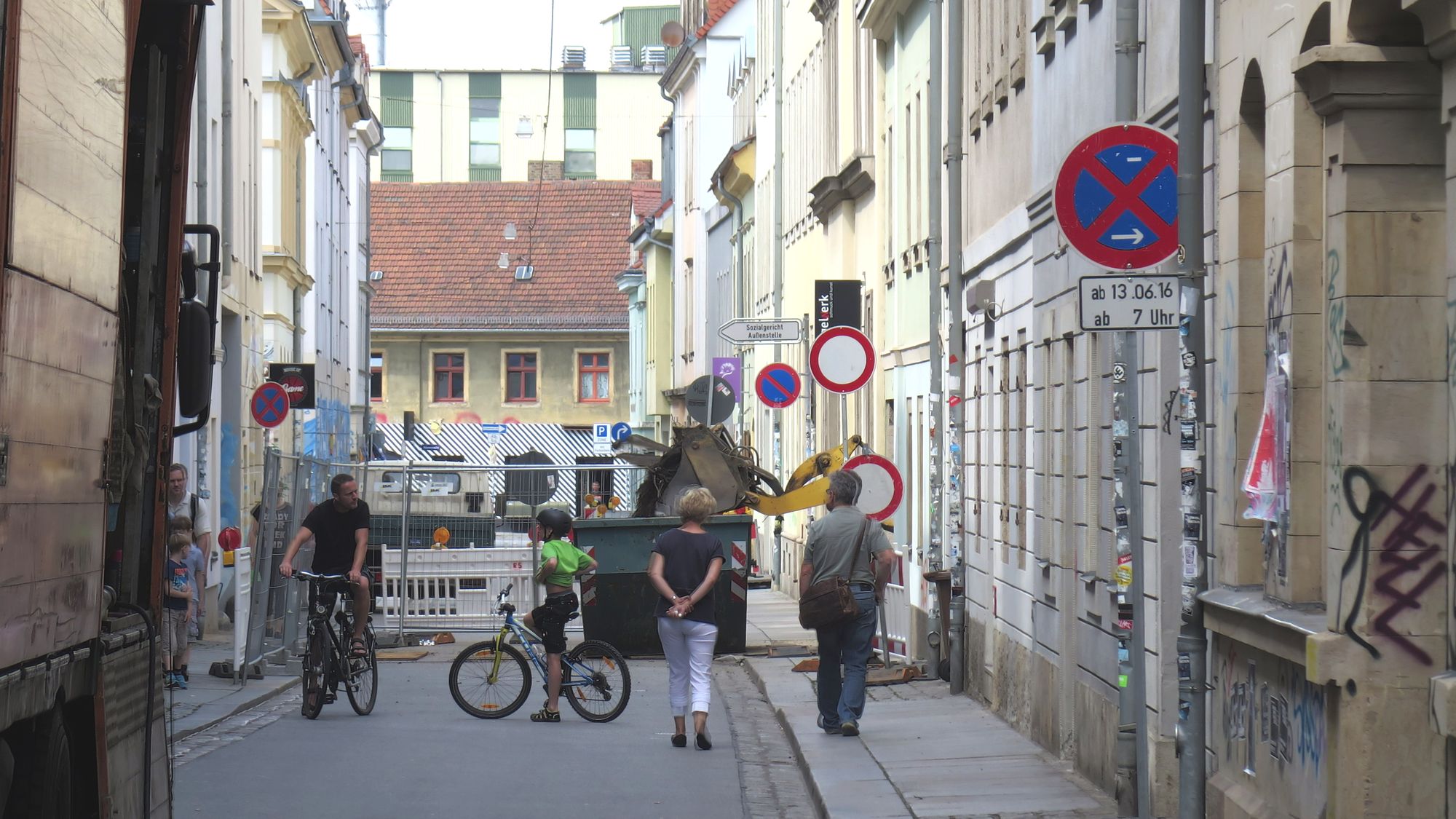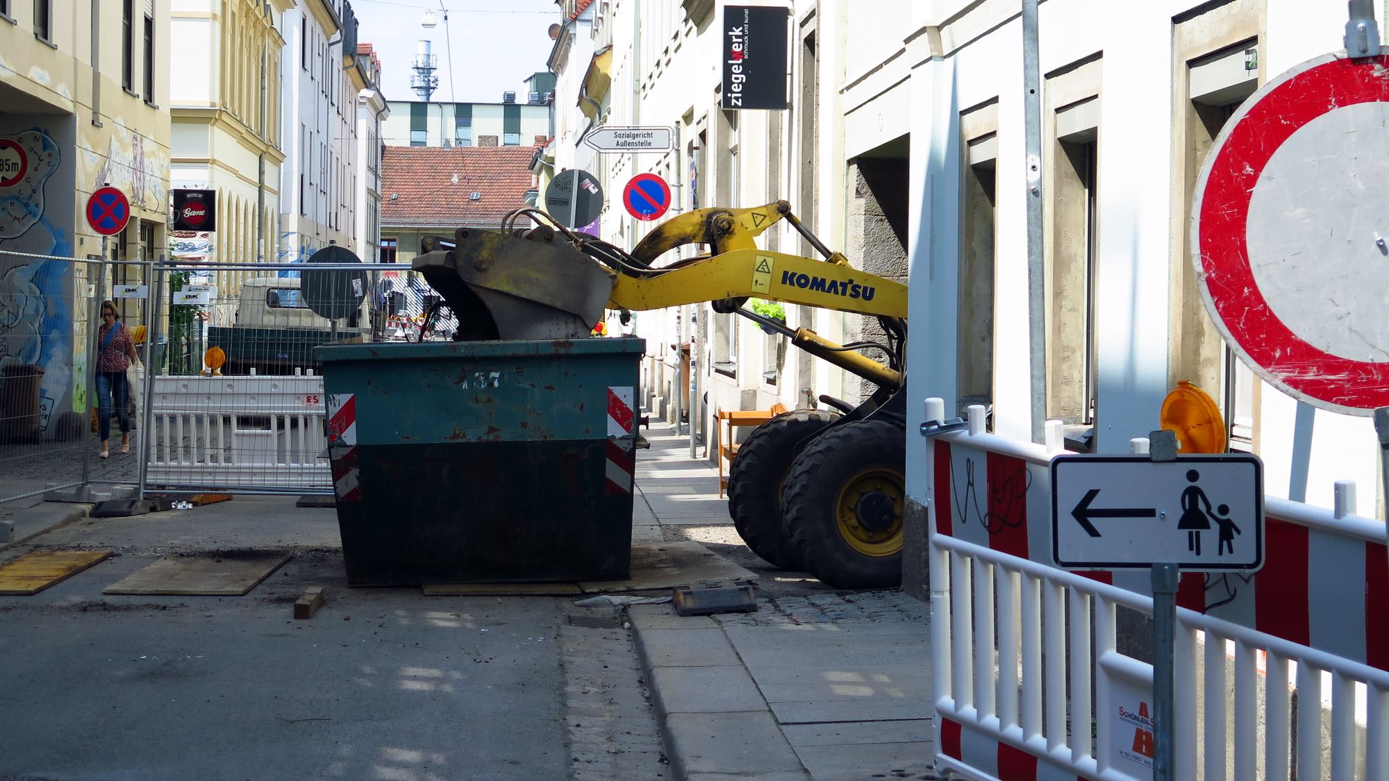 Die Sperrung der Böhmischen zwischen Alaun- und Rothenburger Straße ist noch bis Ende Februar geplant. Die Zufahrt zur Loge, inkl. Fitness-Center und Sozialgericht ist über die Alaunstraße möglich, die Einbahnstraßenregelung ist derzeit aufgehoben. Zu Fuß oder mit dem Rad kommt man ganz gut durch. Aber: Augen auf!