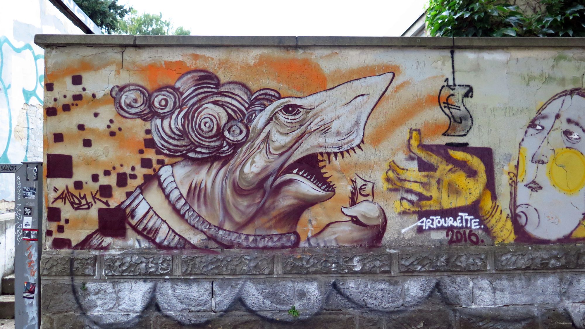 Die Wand gehört zum Gelände der Drewag-Stadtwerke. Der Caligraffiti-Künstler Benuz aus Mexiko dürfte aufmerksamen Dresdnern dank seiner oft figürlichen Wandbilder bekannt sein, die sich durchgängig an Elementen der klassischen Schriftmalerei bedienen, meistens ohne dabei tatsächlich Schrift zu malen, wodurch er seinen einzigartigen Stil schafft. Auch der Dresdner Künstler Artourette ist im Stadtbild vertreten. Mit viel Haltung und auffallend skurriler Motivwahl gestaltet er regelmäßig Fassaden im urbanen Raum, ist jedoch ebenso mit anderen Techniken und Medien vertraut.