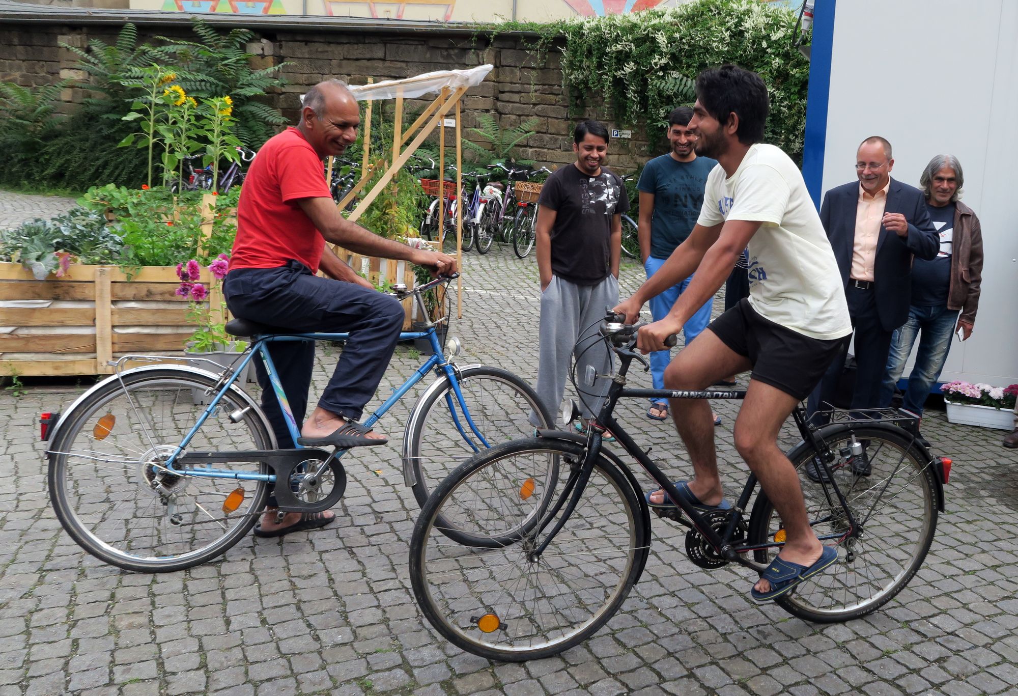 Die Bewohner probierten die Räder bei der Übergabe gleich aus. Sie haben in den vergangenen Wochen mit Polizeihauptmeister Steffen Wündrich jede Menge Verkehrsregeln gepaukt, denn „die deutsche Straßenverkehrsordnung ist nicht einfach“, wie es der anwesenden Ortsamtsleiter André Barth ausdrückte. „Unsere Schulungen sollen dabei helfen, sicher am Straßenverkehr teilzunehmen. Denn viele Verkehrszeichen sind den Teilnehmern unbekannt“, ergänzt Wündrich. Elvira Ploß fügte hinzu: „die Praxis haben wir dann im Hof geübt“. Fehlende Deutschkenntnisse sind kein Problem. Gemeinsam mit dem Gemeindedolmetscherdienst wird in die jeweilige Sprache übersetzt. Die Kosten dafür übernimmt das Ortsamt Altstadt. Die nächsten Termine sind jeweils donnerstags ab 15 Uhr, für den 11. August und 25. August bzw. 15. September und 6. Oktober angesetzt.