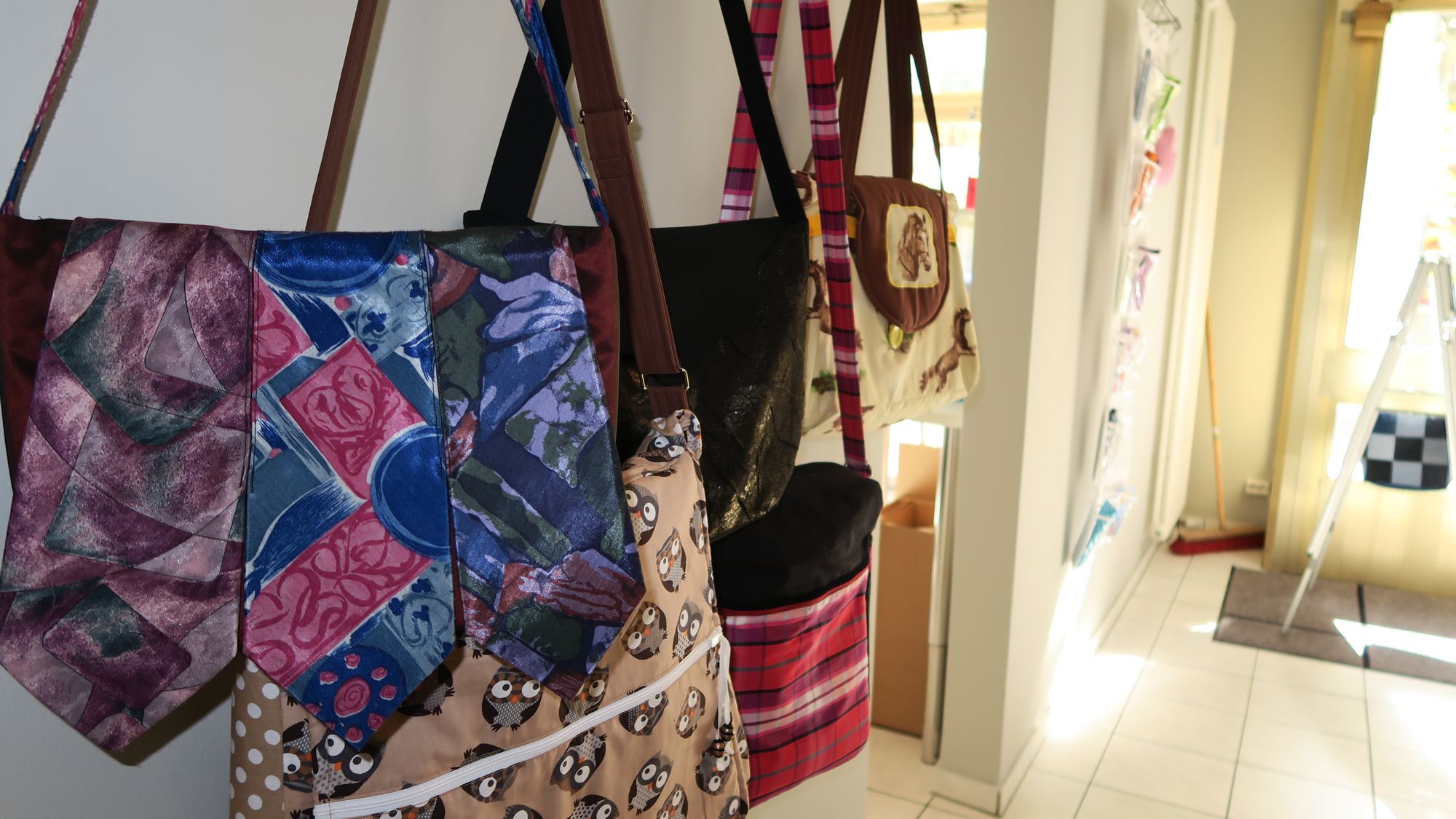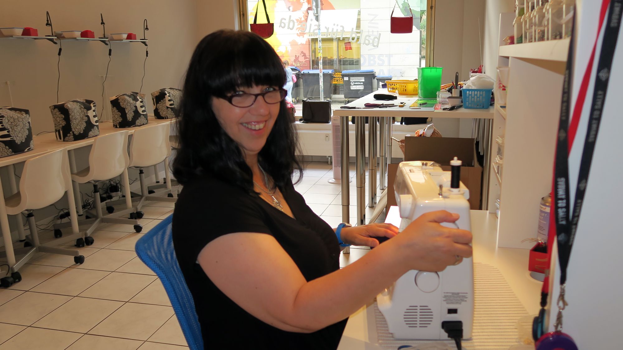 „Ich bin Taschendesigner, verarbeite alles außer Leder“, strahlt sie und wuselt im Geschäft umher, bis zur Eröffnung ist noch einiges vorzubereiten. Im Raum stehen mehrere Nähmaschinen. „Die sind für Teamevents“, erklärt sie, „für Kindergeburtstage oder Junggesellenabschiede, ob da ein sinnvolles Ergebnis rauskommt, ist zweitrangig, es zählt das gemeinsame Erlebnis.“ Dann lacht sie wieder.