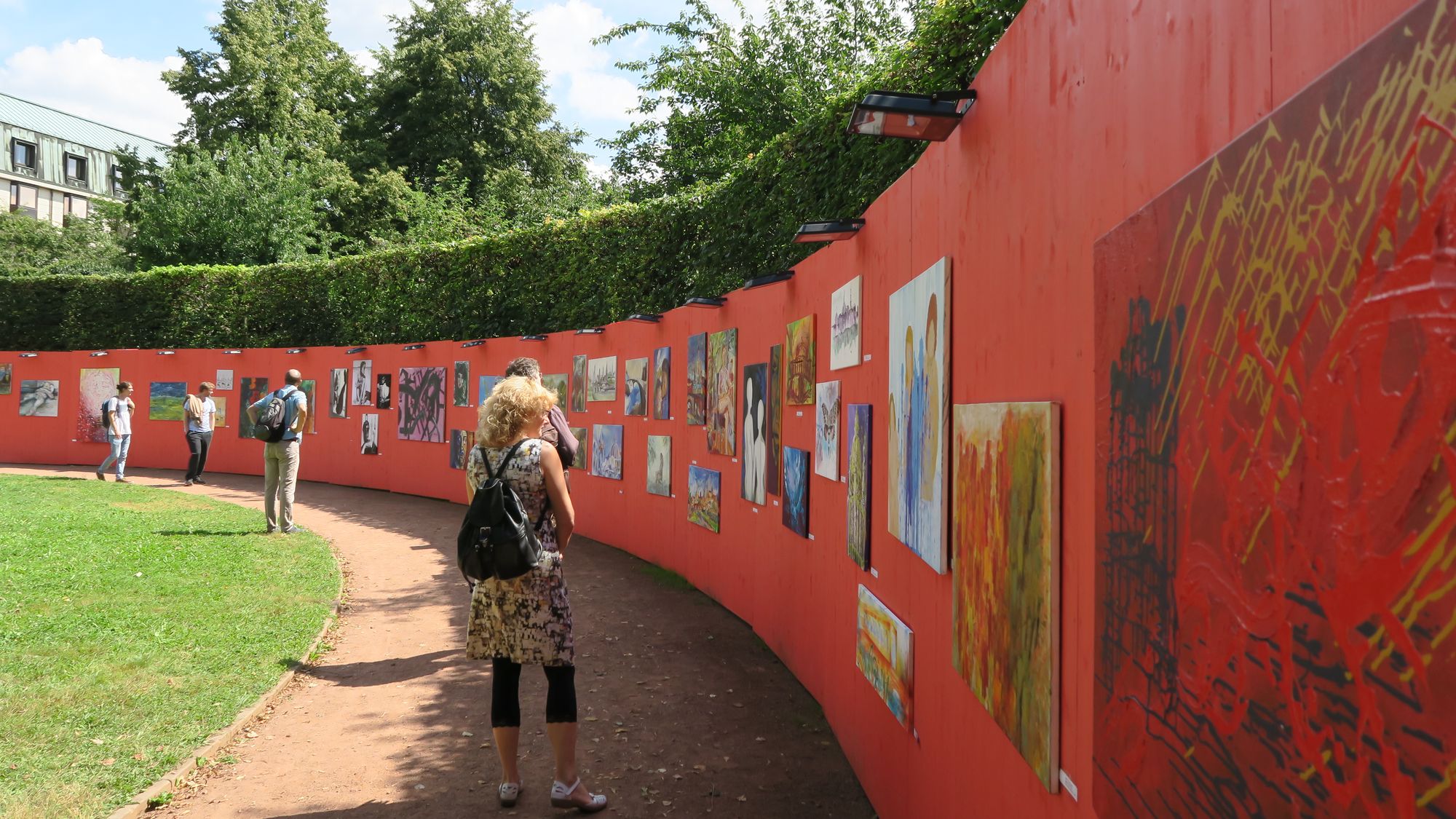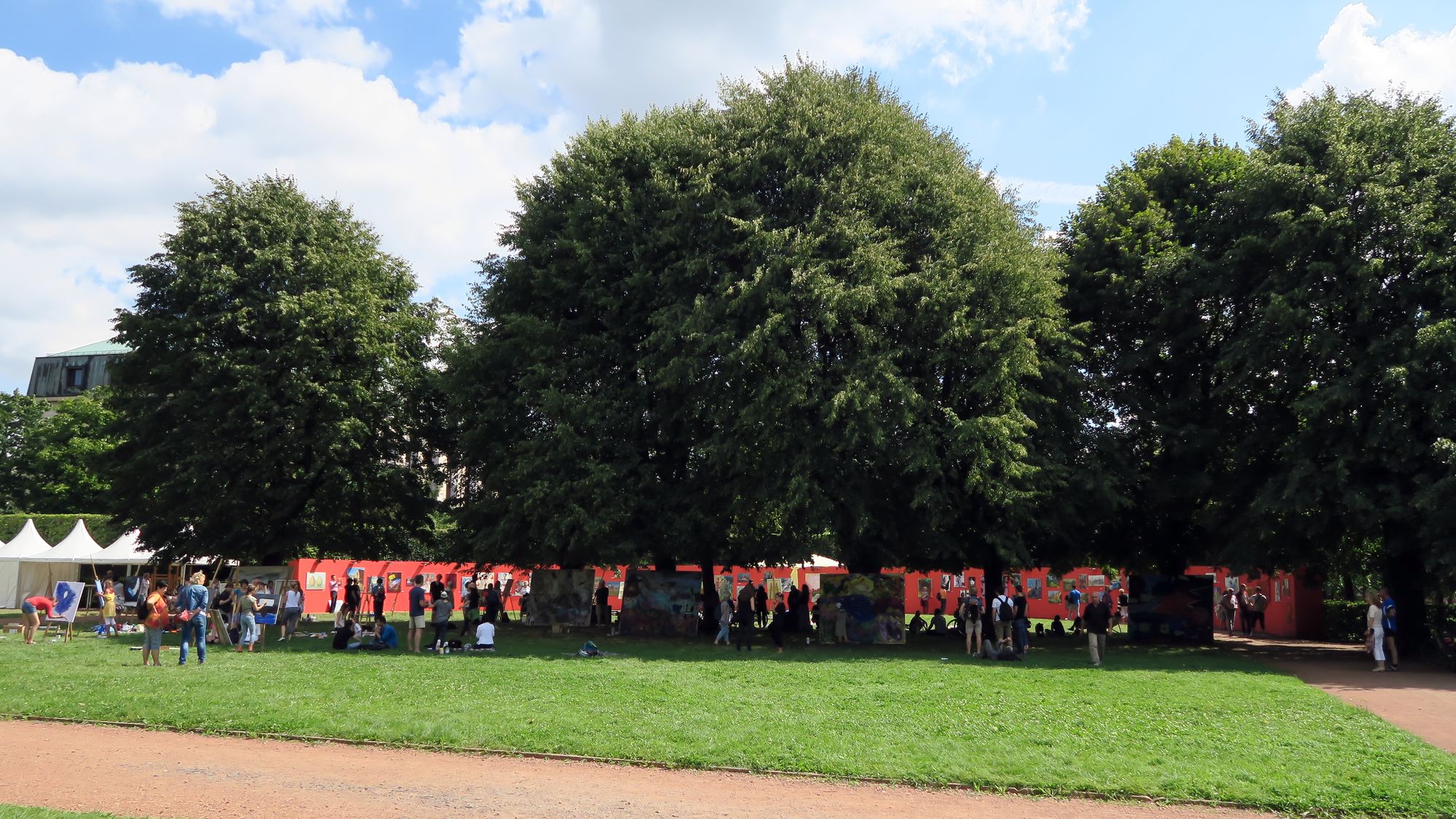Aleko Adamia freut sich besonders über die 60 Meter lange open-air-Galerie, die der Malerei einen wunderbaren Rahmen gibt. Ein paar Schritte nebenan zeichnen Nachwuchskünstler einer Meißner Schule. „Das ist unser Projekt ‚Folge kleinen Herzen‘, dabei können Jungen und Mädchen unter künstlerischer Leitung auf der Leinwand schöpferisch tätig werden.“ Von der Resonanz ist er begeistert: „Täglich sind hier Familien und Schulkinder da, ich hätte nicht gedacht, dass das so gut ankommt.“