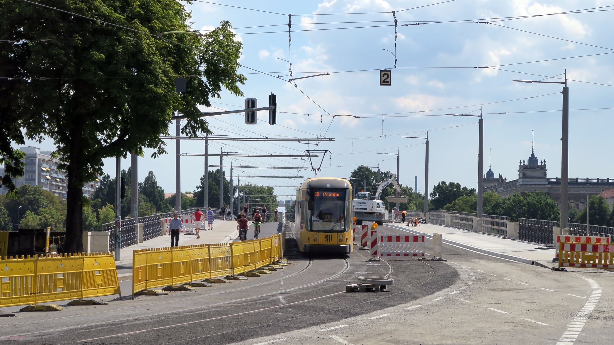Die Bauarbeiten auf der Alberbrücke befinden sich nun im Endspurt. Noch fehlt für die Straßenbahn der Anschluss an das zweite neue Gleis. Deshalb muss auch die Straßenbahn letztmalig von der Brücke weichen. Innerhalb von zwei Wochen werden die Bauweichen entfernt und dafür zwei Mal 50 Meter Gleis eingesetzt. Die Haltestelle Rosa-Luxemburg-Platz erhält zur Eindeckung Pflasterblöcke, so genannte Pflastermonolithe. Neben der Asphaltierung komplettiert der „Fugenverguss“ die Arbeiten an den Straßenbahnschienen. Für die Stromversorgung der Bahnen sind rund 1.200 Meter neue Fahrleitung zu montieren. Die Masten dafür stehen schon. Ganz zum Schluss wird die Signalanlage, die bisher den wechselseitigen eingleisigen Betrieb der Straßenbahnen geregelt hat, abgebaut. Am 5. September, 4 Uhr können die Linien 6 und 13 wieder uneingeschränkt über die Albertbrücke fahren, um 9 Uhr wird der Erste Bürgermeister Detlef Sittel die sanierte Albertbrücke offiziell für den Verkehr freigeben.
