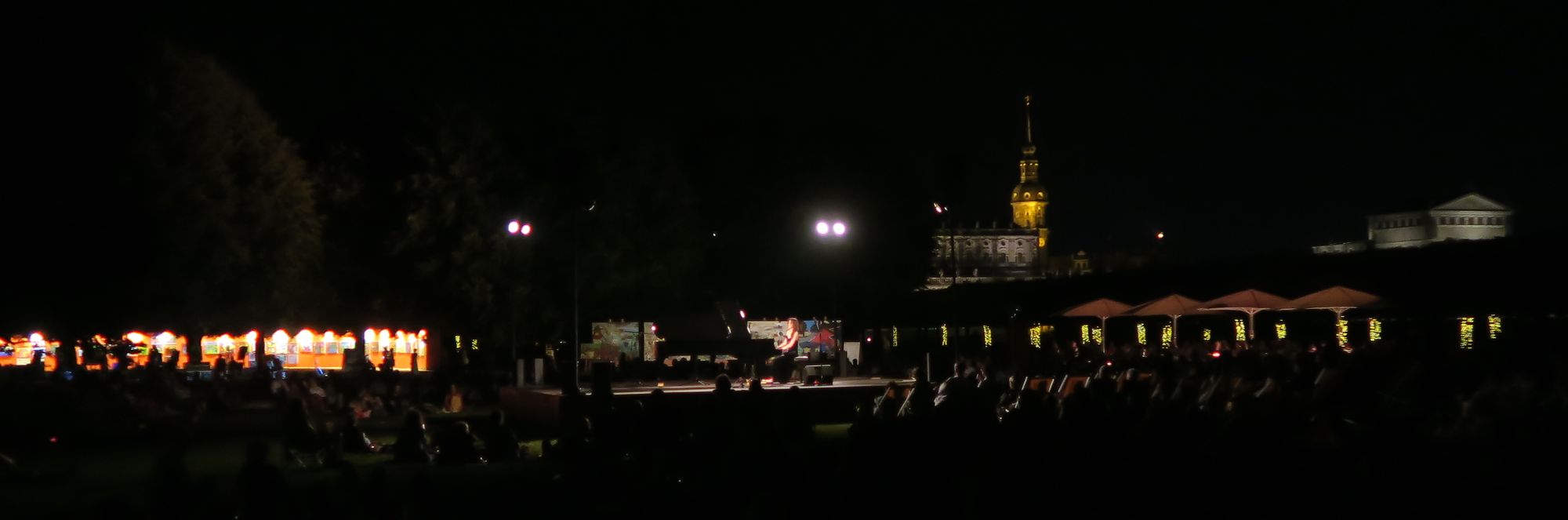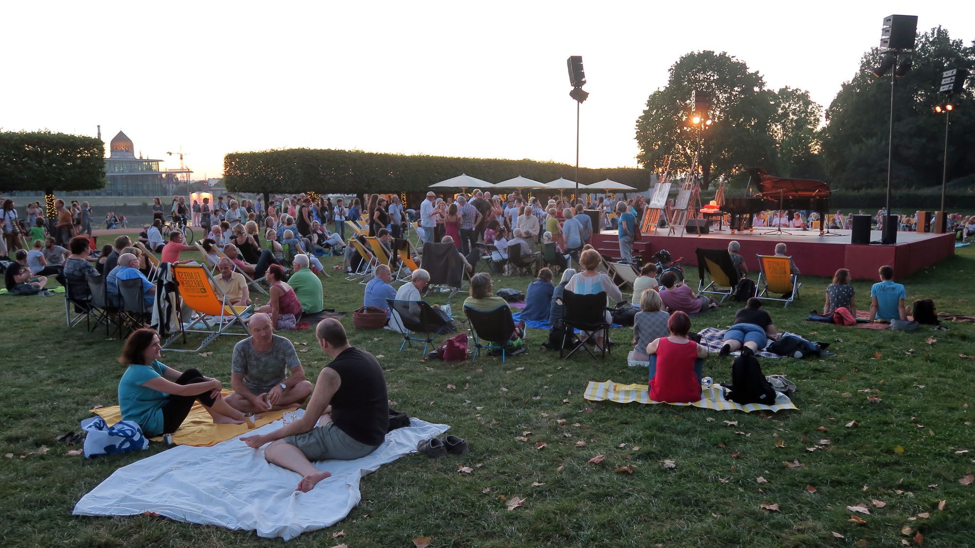 Der Flügel glänzt im Scheinwerferlicht. Die Sonne verschwindet so langsam hinter der Yenidze am anderen Elbufer. Unter den Platanen hinterm Japanischen Palais haben sich ein paar hundert Leute versammelt. Einige lümmeln auf mitgebrachten Decken, andere habe sich Liegestühle ausgeliehen, und auch der gute alte DDR-Campingstuhl ist zu sehen. Es wird geschnattert, gesüffelt und gemumpelt.