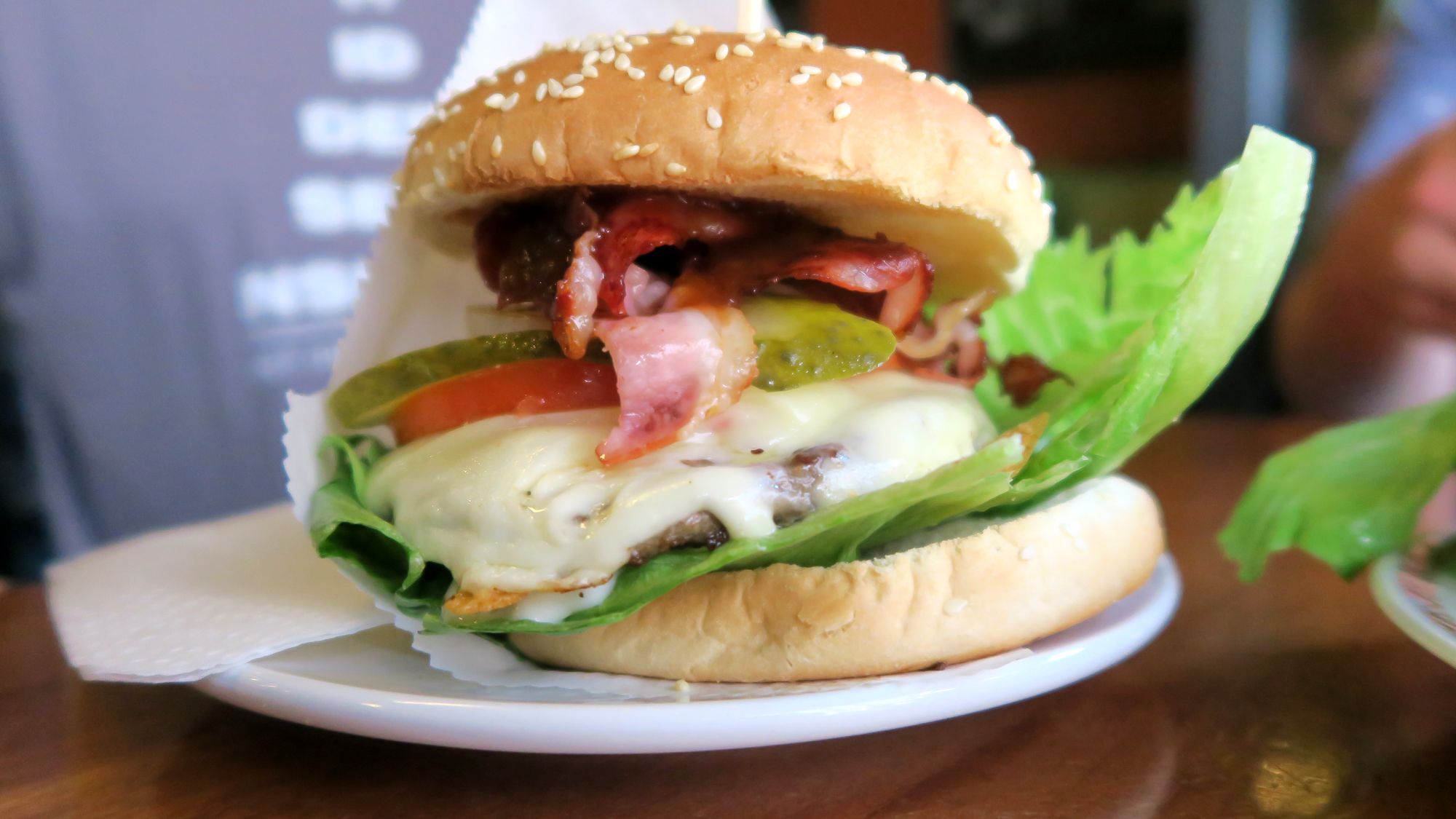 Erstaunlich zügig erhalten wir unsere Speisen und schmausen drauf los. Meine beiden Begleiter haben mit tropfender Soße zu tun und halten ihr Burger zum Abtropfen schräg. Der Geschmack und die Würze soll aber in Ordnung sein. Auf den ersten Blick sieht es auch sehr lecker aus, wie sich Gurke, Schinken und Käse um die Boulette ranken.