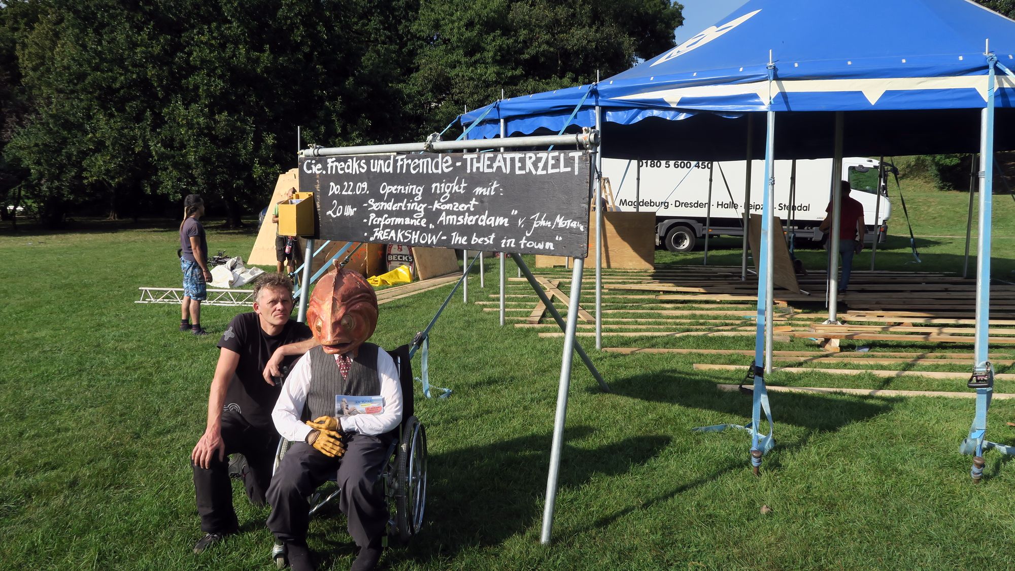 Heiki Ikola am neuen Zirkuszelt auf dem AlaunplatzSeit gestern steht auf dem Alaunplatz ein Zirkuszelt. Die Macher sind die Künstlergruppe „Cie. Freaks und Fremde.“ rund um Schaubuden-Mitdirektor Heiki Ikkola. Der half gestern auch gleich noch kräftig mit beim Aufbau.