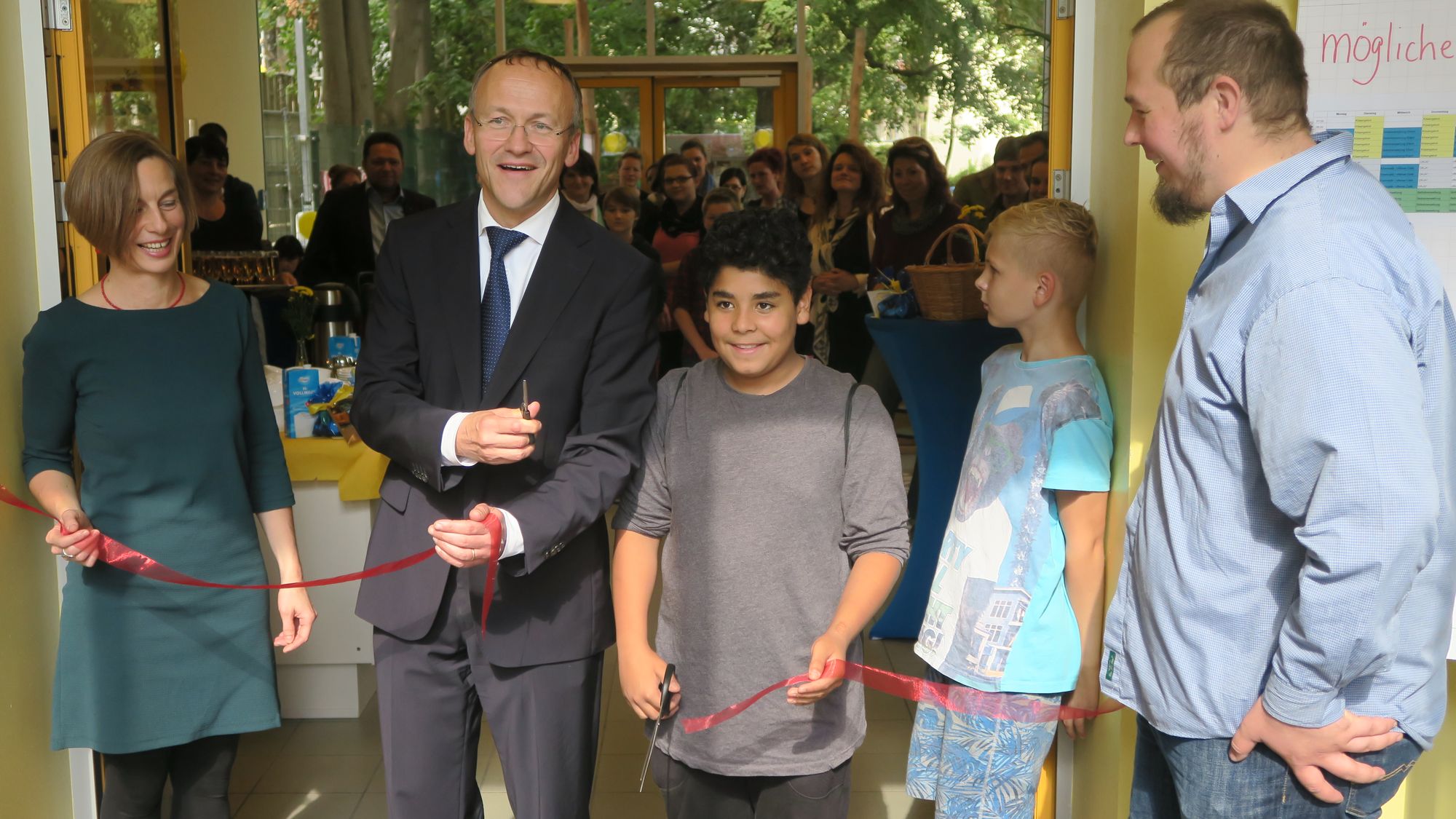 OB Dirk Hilbert (FDP) und Sozialbürgermeisterin Kristin Kaufmann (Linke) hatten keine Zeit, also musste der Personal-Bürgermeister Peter Lames (SPD) die Schere halten. Den Kindern und Jugendlichen wird es egal sein und die Verantwortlichen im Haus freuten sich auch so über den neuen Raum. Der Pädagoge Jonas Trautmannn erläutert das Konzept: „Wir haben jetzt eine zentralen Raum für alle“. Tagsüber wird der Raum überwiegend für die offene Kinder- und Jugendarbeit und die Angebote des Hauses genutzt, abends steht er im Zeichen der Selbstverwaltung. „Das bedeutet, dass man sich anmelden kann, um hier einen Vortrag zu halten, nen Film zu gucken oder auch eine kleine Feier abzuhalten“, erklärt Trautmann.