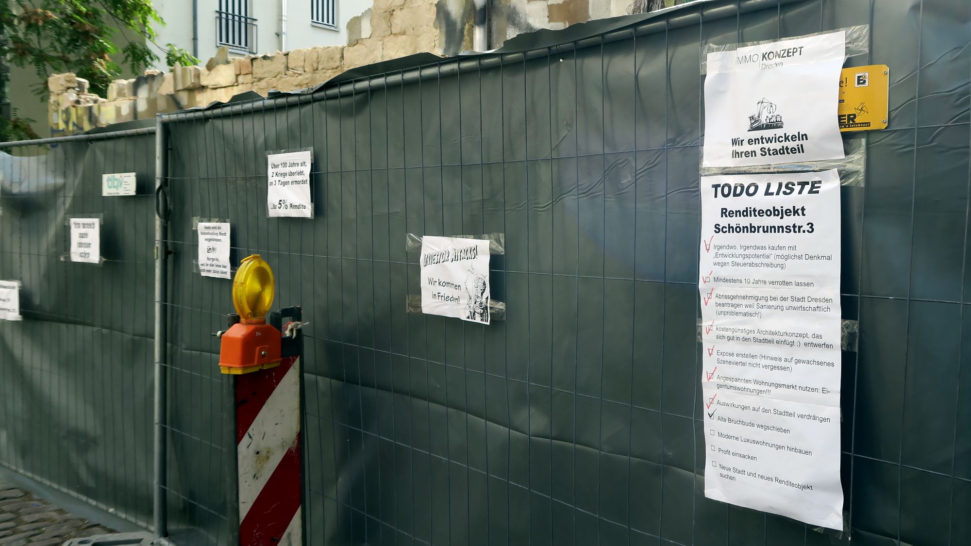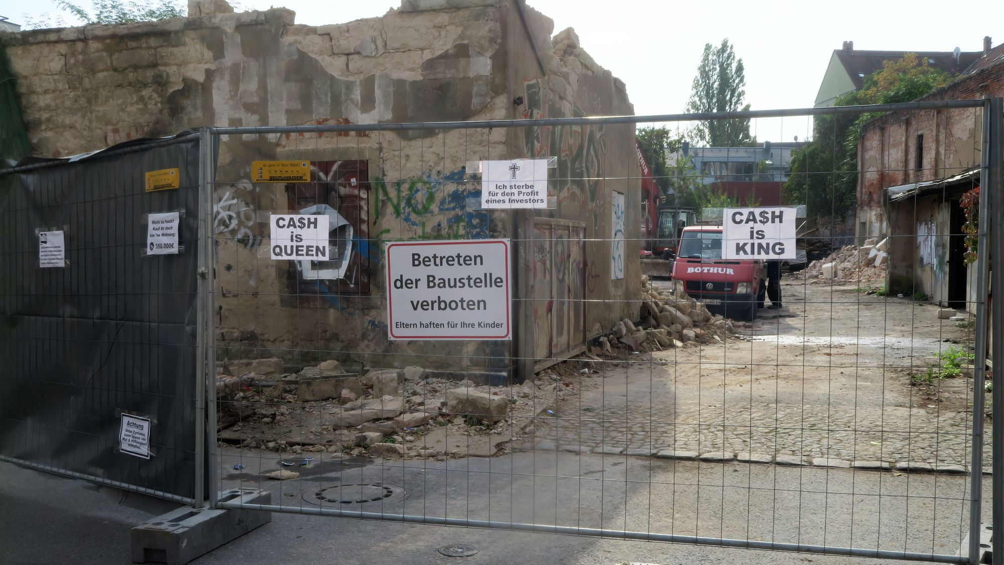 Das Gebäude stand eigentlich unter Denkmalschutz, war aber so verfallen, dass der Investor es abreißen darf, um an der Stelle mehrere Neubauten mit Eigentumswohnungen zu errichten. Vergangene Woche hatte der Abriss begonnen (Neustadt-Geflüster vom 15. Oktober). Kritiker sind nicht nur die unbekannten Plakat-Hänger. Auch der Fraktionschef der Grünen, Thomas Löser ist sauer. „Der Abriss ist empörend, die Äußere Neustadt verliert damit eines der ältesten noch vorhanden Gebäude.“
