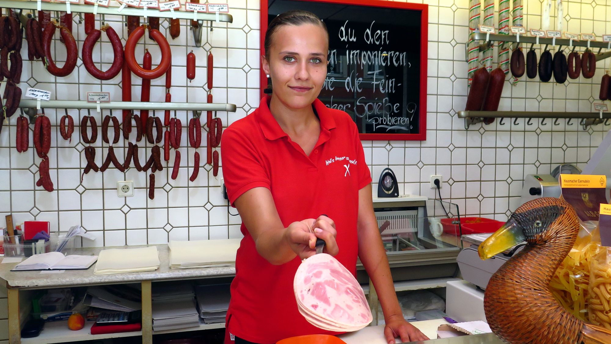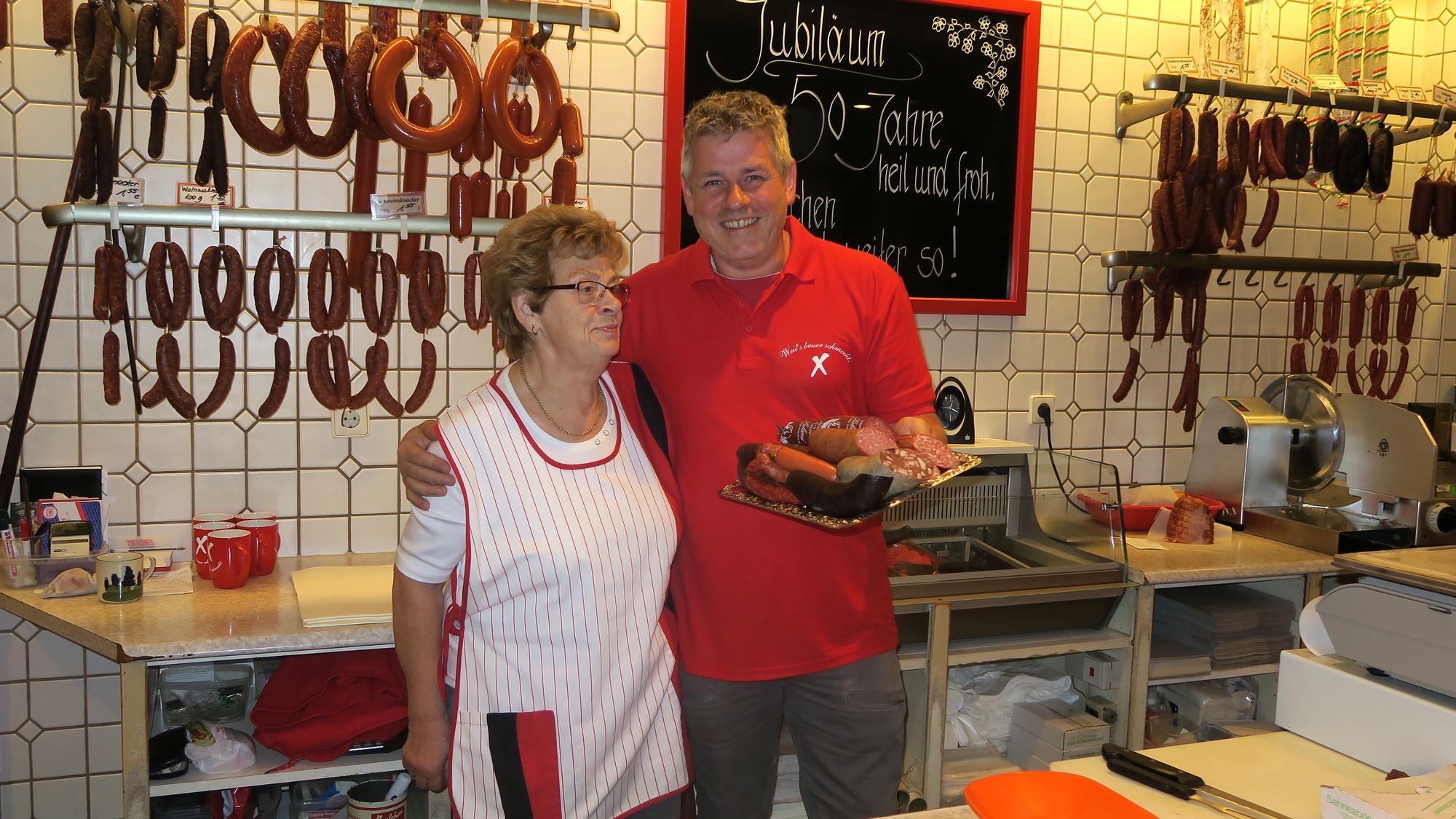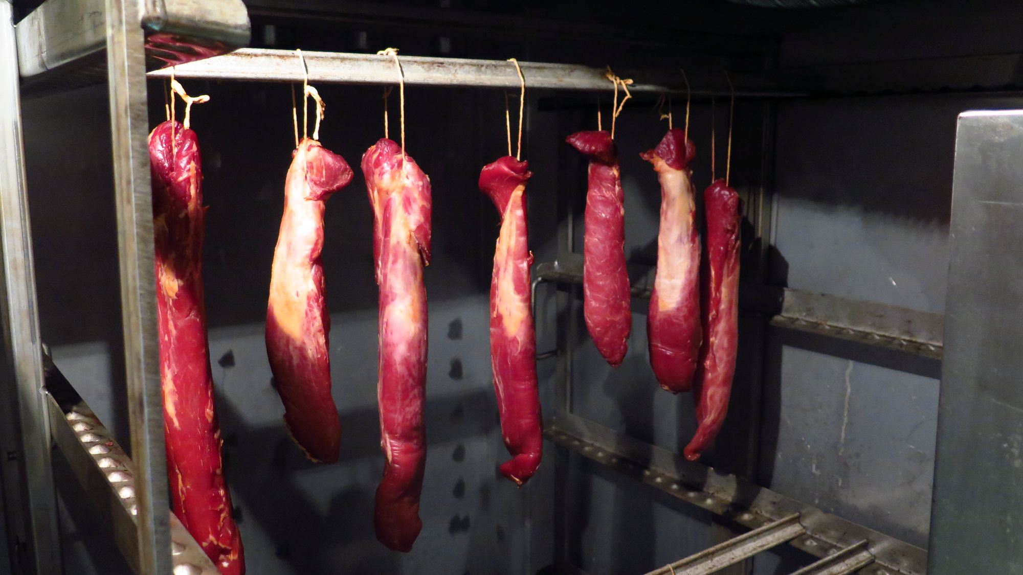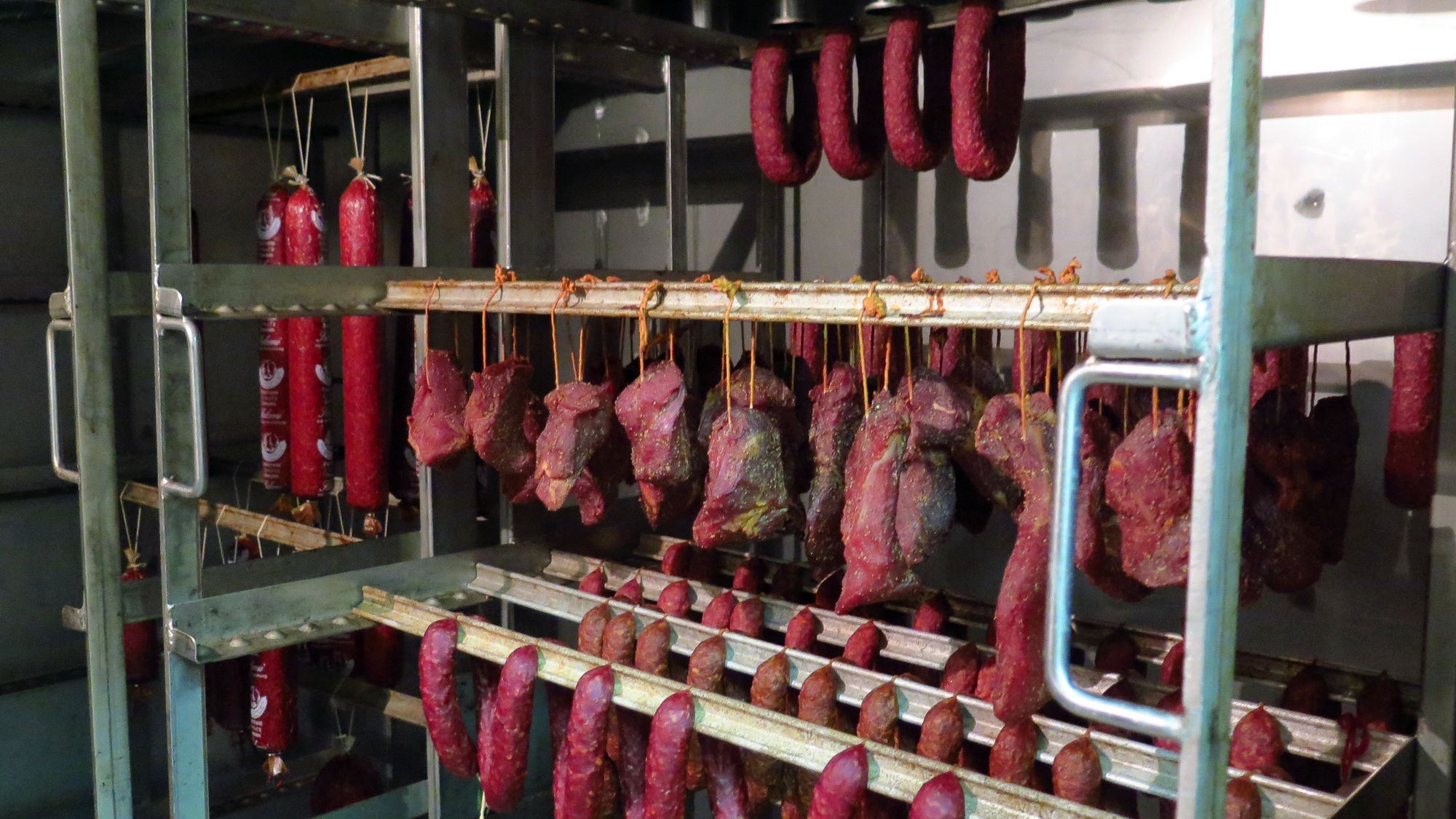 Nach der Wende wuchs das Geschäft, hier im Lädchen kamen immer mehr Leute zu Besuch. Sven machte 1992 seinen Meister und arbeitet seitdem hier mit. 2007 übernahm er dann das Geschäft vom Vater. Heute sind hier insgesamt 24 Leute angestellt. Täglich werden rund 200 Kilo Wurst hergestellt. „99 Prozent machen wir selber“, schmunzelt Sven. Bis auf exotische Köstlichkeiten wie ungarische Salami, Serano-Schinken und Käse. Mittags gibt es ein kleines Imbiss-Angebot.
