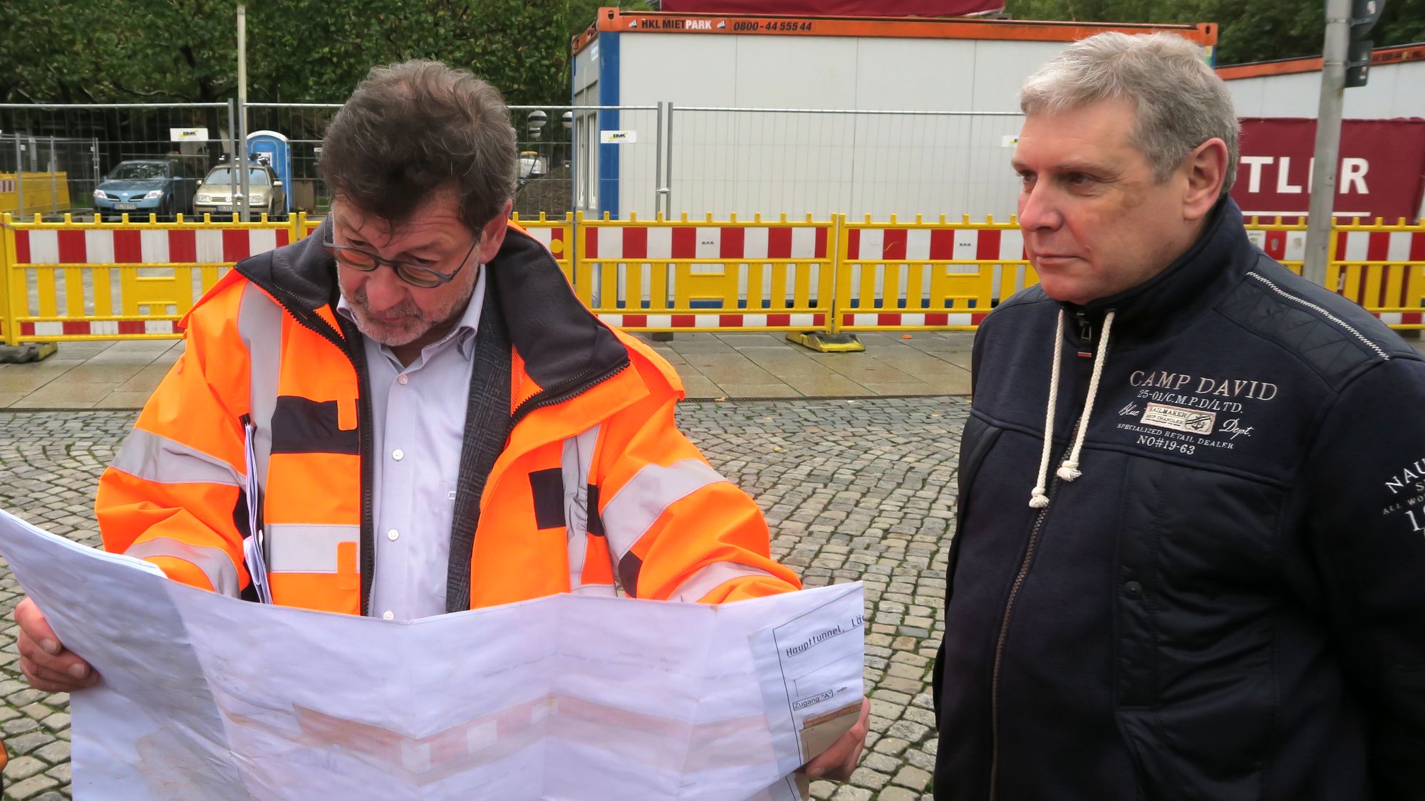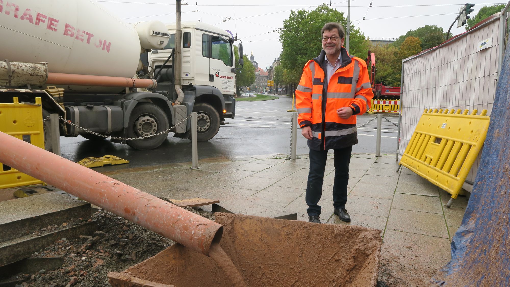 Die Verfüllung des Tunnels zwischen Neustädter Markt und Augustusbrücke läuft planmäßig. Reinhard Koettnitz, Leiter des Straßen- und Tiefbauamtes, lud heute zum Ortstermin und zeigte mit Wilfried Bachmann, dem Geschäftsbereichsleiter der ausführenden Firma Nestler die Baustelle und erklärte wie die Verfüllung funktioniert.