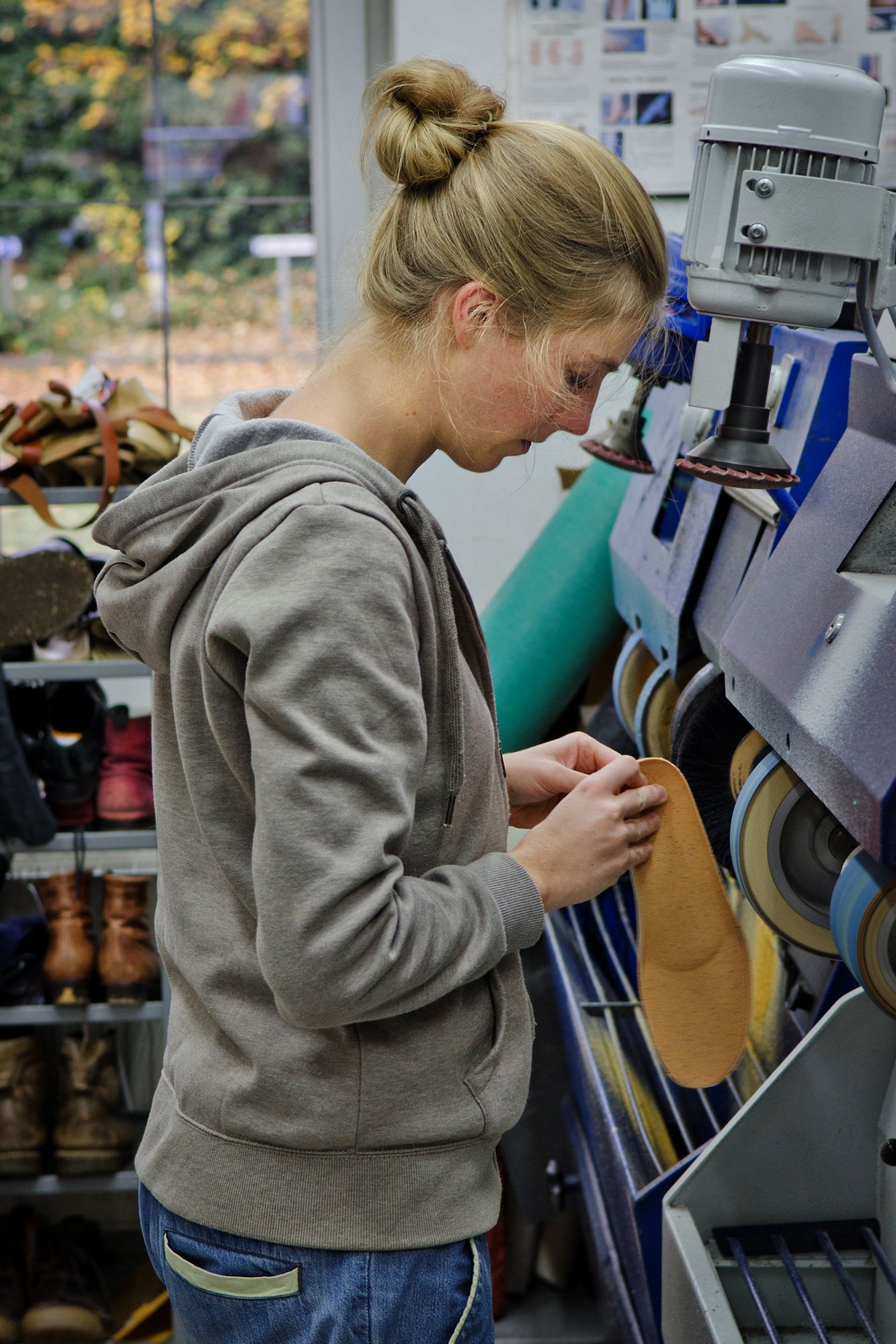 Auszubildende Juliane Köhler – Foto: Thomas Alexander LeikaufRenatus Meyer beschloss schon früh, sich um das Wohl weher Füße zu kümmern. Seine Eltern sind Besitzer des Schau-Fuss-Ladens, der vor zwei Jahren auf die Rothenburger umzog. Bevor Sprößling Renatus sich auf der Alaunstraße in direkter Nachbarschaft zum elterlichen Geschäft sesshaft machte, tourte er rund um den Globus. Immer im Dienste des gesunden Treters. Nach dem klassischen Chronologie Abi-Zivi-Pausenjahr absolvierte Rentaus eine Ausbildung als Orthopädieschuhmacher. Dann reiste er ein halbes Jahr nach London, arbeitete zwei Jahre im Schwarzwald, ging nach Tokio und Sapporo, um dort zu lernen und zu lehren. „Das Orthopädiehandwerk entstand in Deutschland, Österreich und der Schweiz“, erklärt er. Das resultierte aus den zahlreichen Opfern des Zweiten Weltkriegs, denen mit speziellen Schuhen bei fehlenden Gliedmaßen geholfen wurde.
