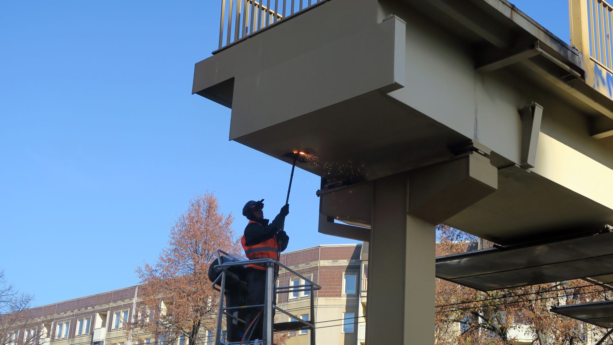 Für das mittlere Teil, die eigentliche Brücke, die allein schon etwa 50 Tonnen wiegt, mussten zahlreiche zusätzliche Verankerungen gelöst werden. Das führte zu Verzögerungen. Wie die Dresdner Verkehrsbetriebe per Twitter mitteilen, bleibt die Straßenbahntrasse voraussichtlich bis 17 Uhr gesperrt. Ursprünglich sollten die Bahnen schon ab 15 Uhr wieder fahren. Außerdem schweißten die Arbeiter Löcher in das Metall, damit Wasser, dass sich in dem Bauwerk angestaut hat, abfließen konnte.