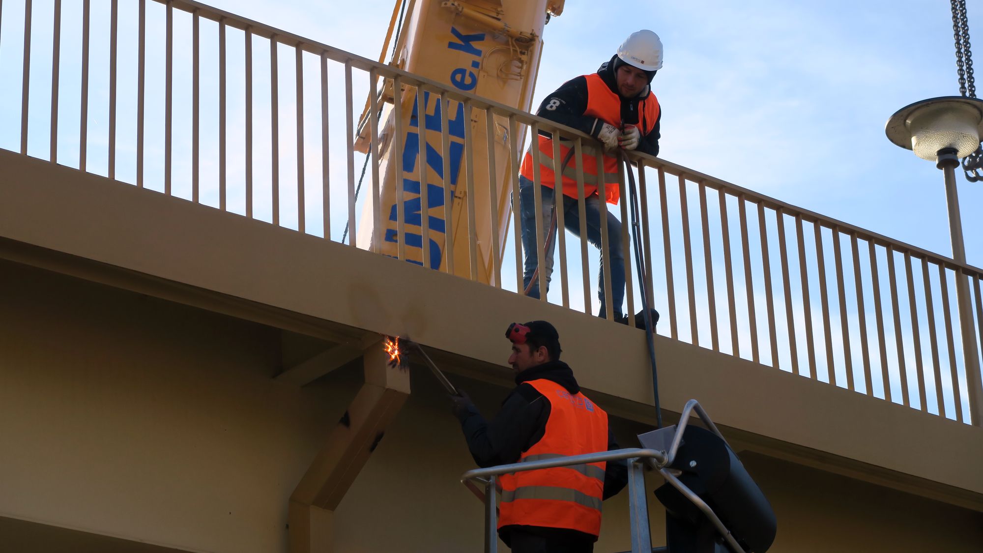 Zuerst haben die Arbeiter die Stahl-Treppen auf beiden Seiten mit Schweißbrennern gelöst. Gegen 11 Uhr hing dann die West-Treppe in der Luft. Der riesige Kran hob die Treppen-Teile anschließend auf einen LKW.