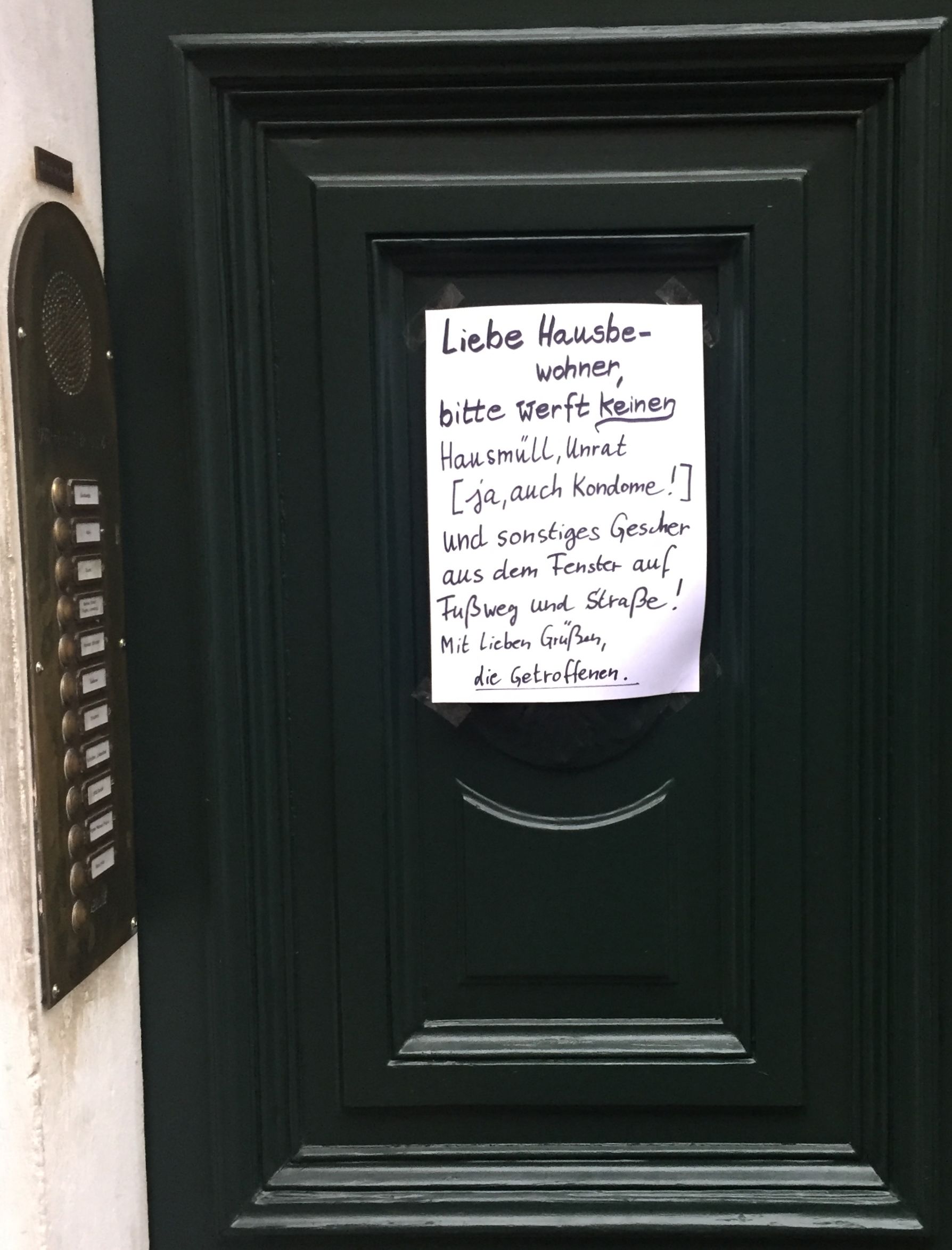 Falls ihr auf der Förstereistraße unterwegs seid, Vorsicht. Denn dort fallen zum Teil sehr glitschige Dinge herunter. Davor warnen zumindest die Getroffenen in einer Hausmitteilung.