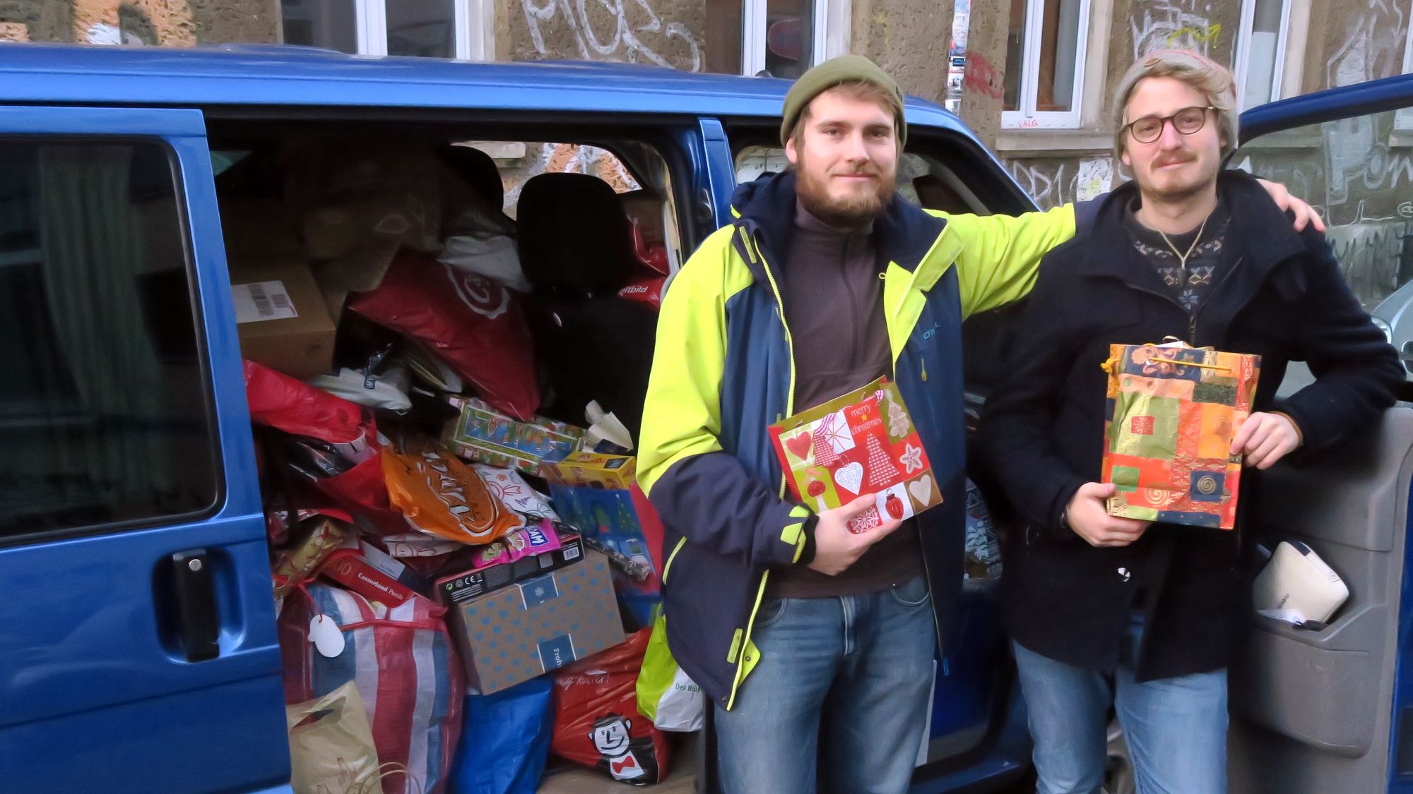 Gestern Nachmittag kamen Johannes und Oliver mit ihrem vollen Bus auf der Schwepnitzer Straße an, zur Einpack-Aktion hatten sie noch Freunde eingeladen. Heute drehen sie ihre Tour, fahren unter anderem zur Stadtmission Dresden, dem Kinderhaus Rabe und auch zwei Flüchtlingsunterkünfte, die sich um unbegleitete Minderjährige kümmern, erhalten Geschenke.