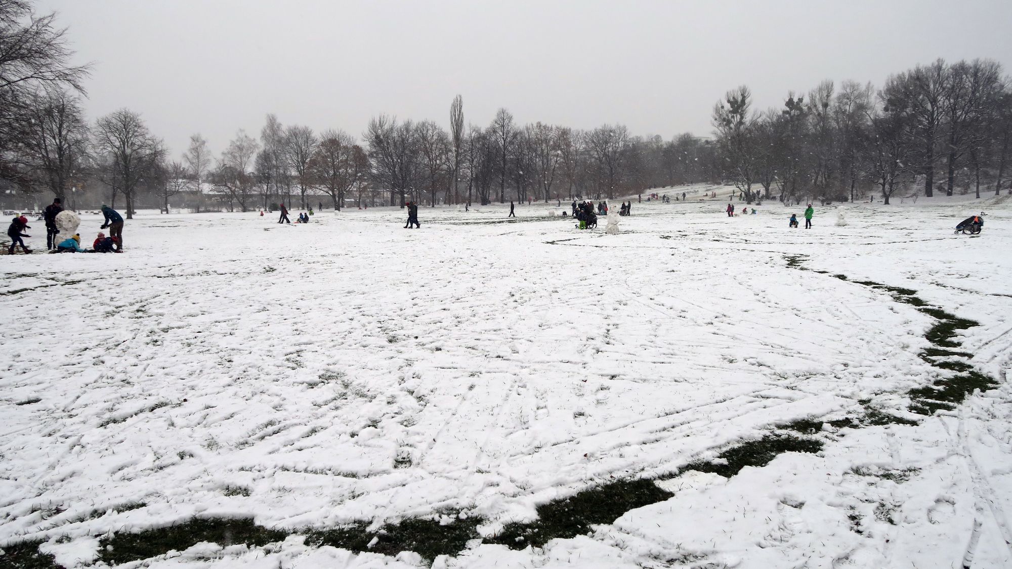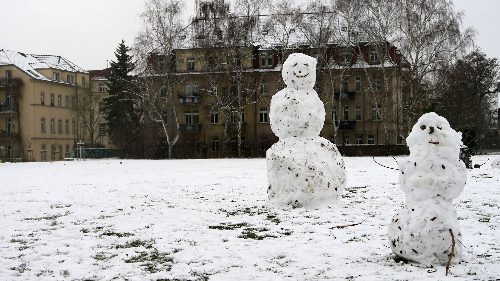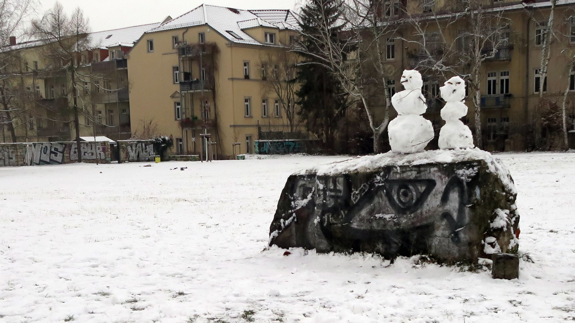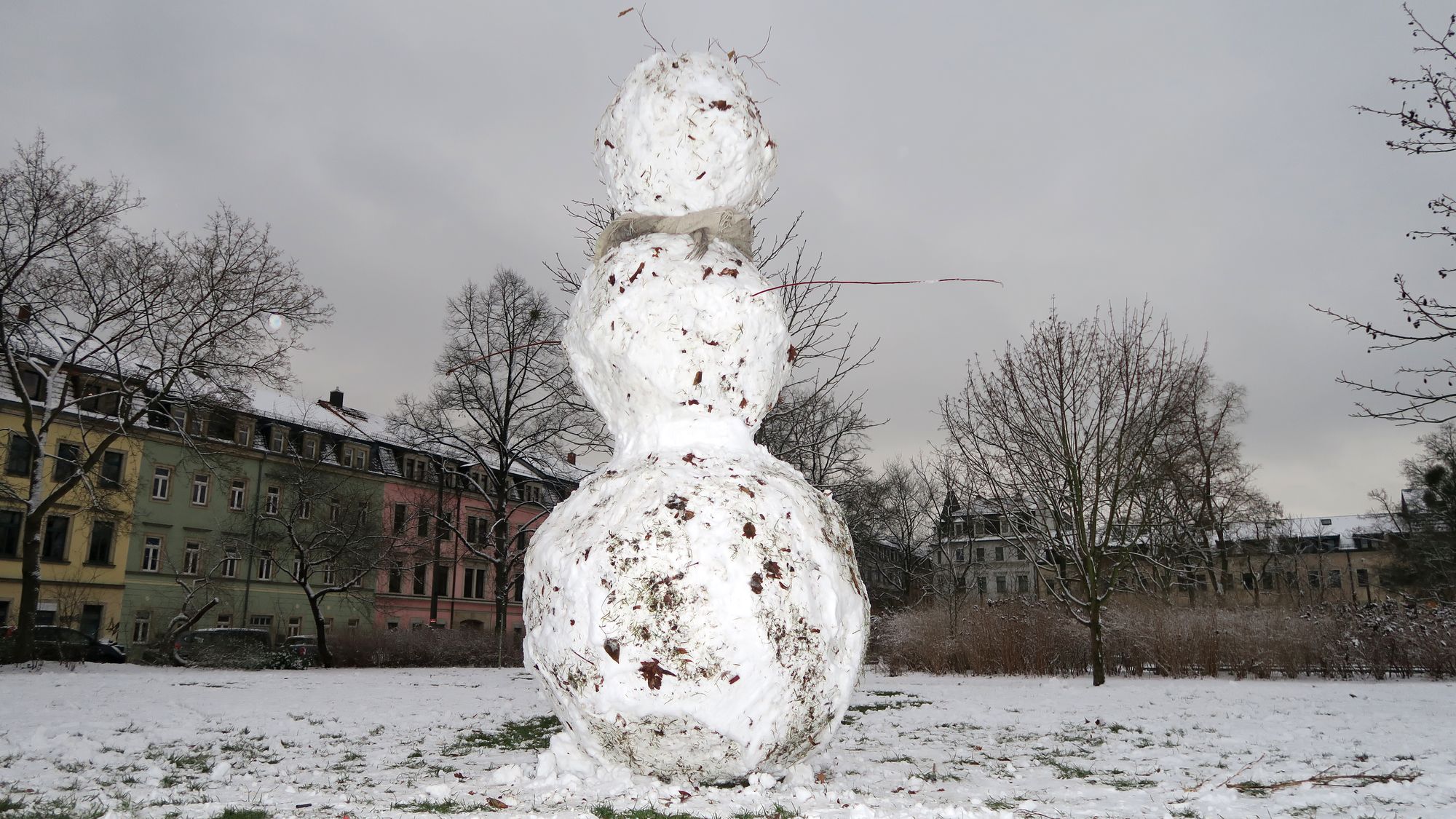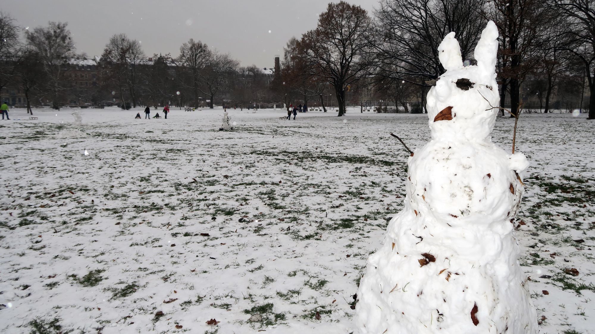 I am the greatest!Der Flockenwirbel heute Mittag hat die Neustadt eingezuckert. Und auf dem Alaunplatz sind ein ganzes Rudel Schneemänner, -hasen und -frauen entstanden. Der größte unter ihnen war bestimmt 2,50 Meter hoch. Pappschnee sei dank.
