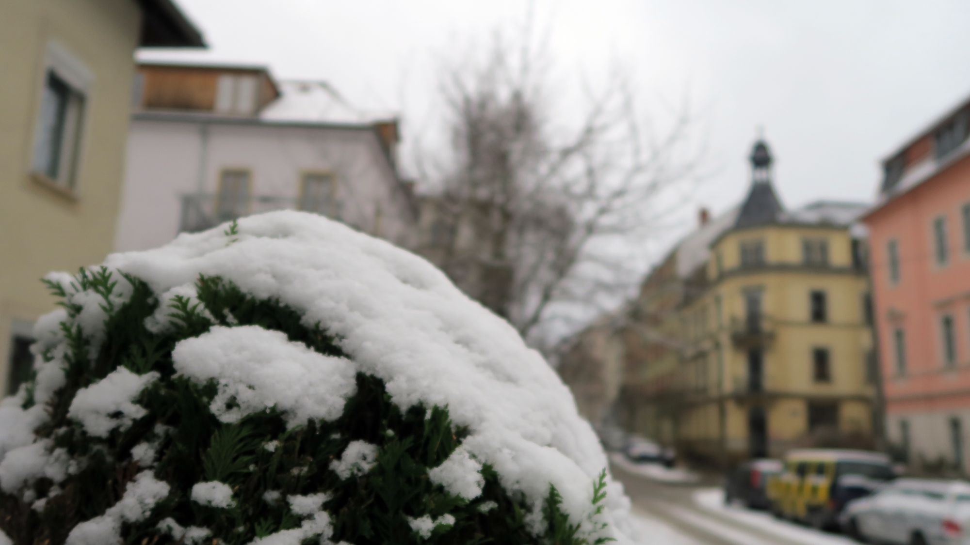 Alaunplatz in grau, der Schnee deckt den Silvestermüll nur halbwegs ab.