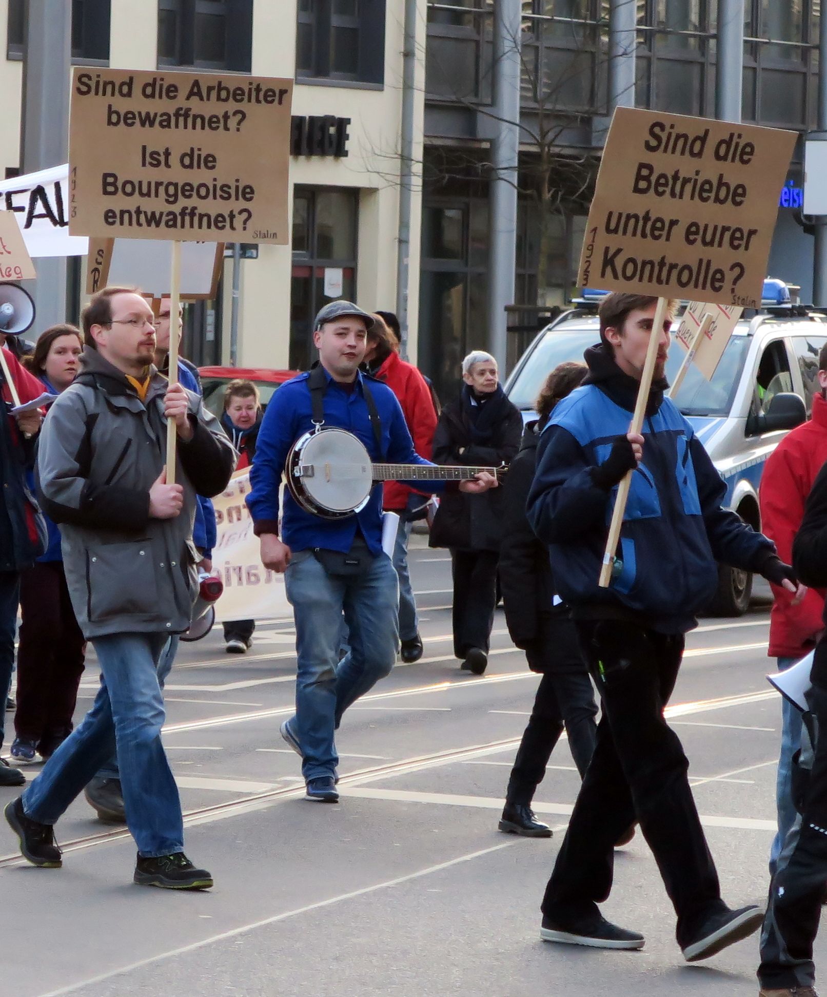 Ich hatte den Eindruck, dass die alles „revolutionäre“ von vor 100+ Jahren zusammengewürfelt haben und daraus einen bizarren Umzug gebastelt haben. Was eine FDJ-Fahne jetzt mit Revolution zu tun hat, hat sich mir allerdings nicht erschlossen.