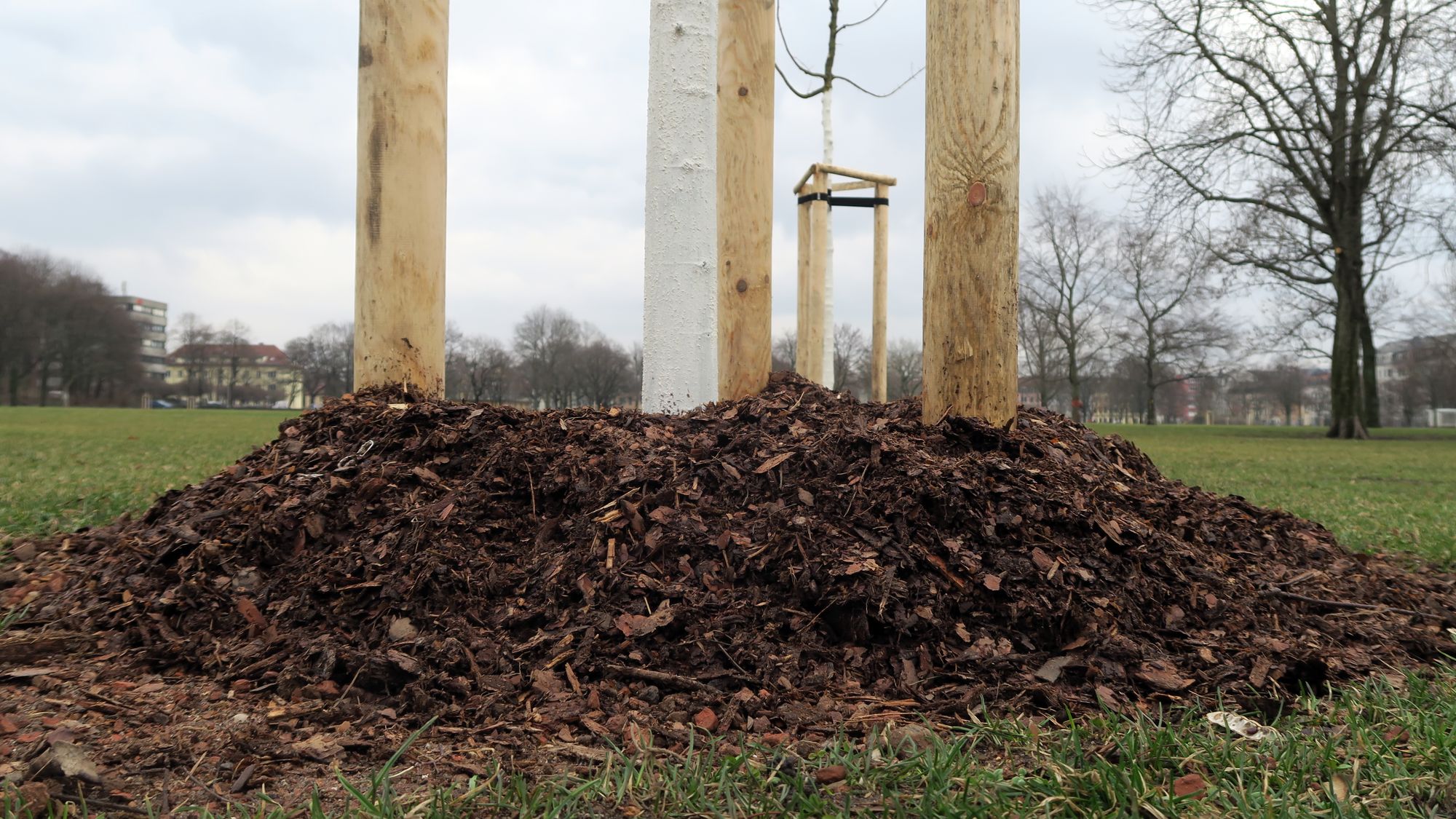 Die Jung-Bäume werden gestützt und mit angehäufelter Erde geschützt.Für eine Straßenbaumpflanzung muss je nach Aufwand mit bis zu 3 500 Euro pro Baum gerechnet werden. Die Kosten fallen für die Vorbereitung des Standortes, die Pflanzware (die Jungbäume haben einen Stammumfang von 18 bis 20 Zentimetern), Substrat, Verankerung, Bewässerungs- und Belüftungsset, Gehwegangleichungen sowie die Fertigstellungspflege an. Für Baumpflanzungen in Park- und Grünanlagen sind der Aufwand und damit auch die Kosten in der Regel geringer.
