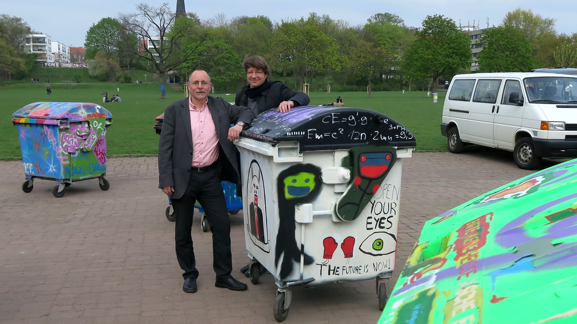 Ortsamtsleiter André Barth und der Geschäftsführer der Waldorfschule Holger KehlerGemeinsam mit Vertretern der Stadtreinigung und des Gewerbe- und Kulturvereins hat Ortsamtsleiter André Barth heute um 15 Uhr die Parksaison auf dem Alaunplatz eröffnet. Die Stadtreinigung spendiert dem Park für die Sommerzeit wieder ein paar zusätzliche Mülltonnen. Neu in diesem Jahr, die einst mobilen Tonnen sind jetzt fixiert und aus Blech. Denn in den vergangenen Jahren ist die eine oder andere Tonne abhanden gekommen bzw. aufgrund von unsachgemäßer Asche-Einfüllung niedergebrannt.