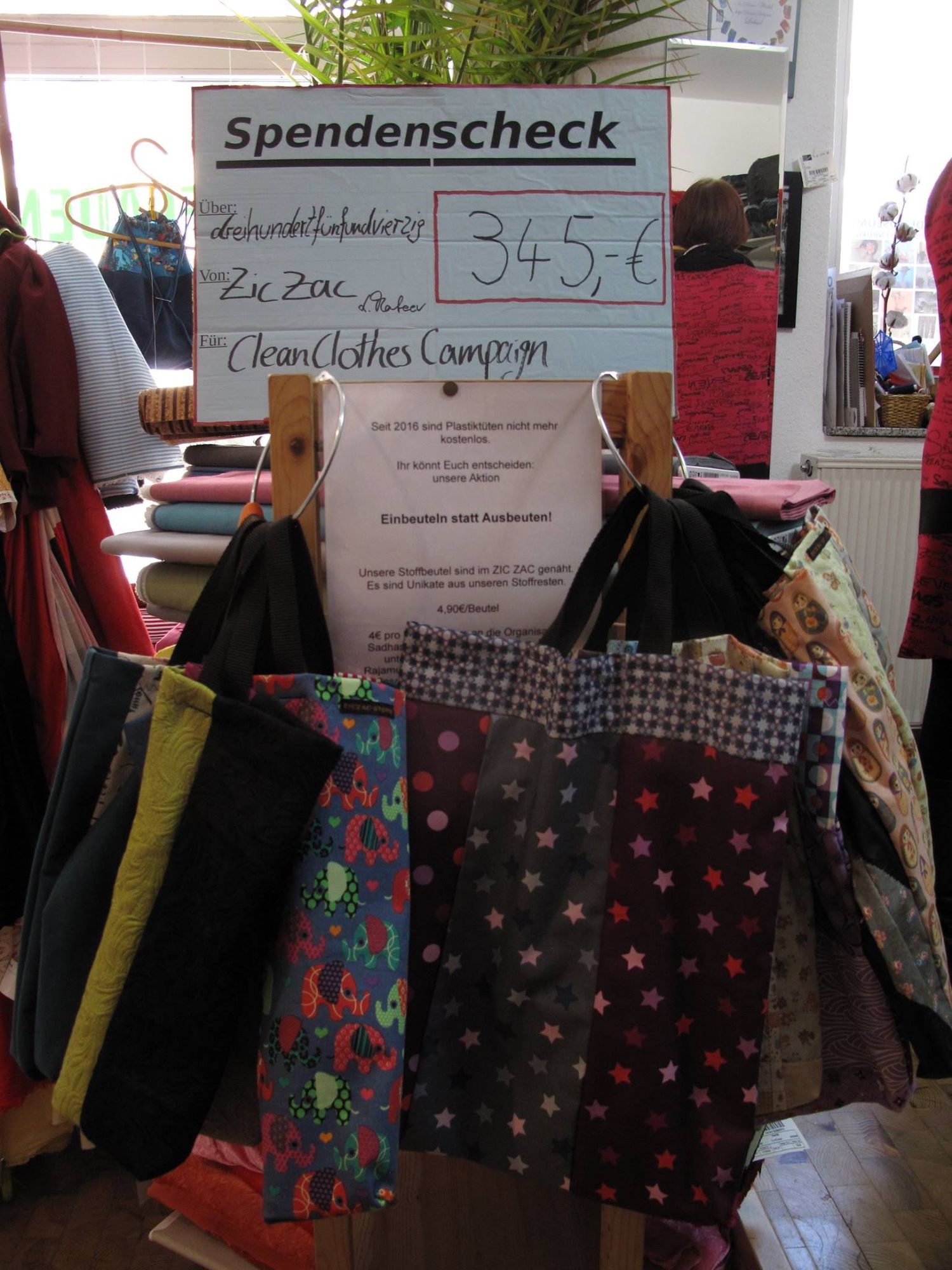 Laden-Chefin Lorna Mateev übergab gestern in ihrem Laden auf der Förstereistraße 37 die durch den Verkauf phantasievoller, witziger Stoffbeutel erwirtschafteten Mittel an Fabienne Winkler von der Kampagne für Saubere Kleidung. Insgesamt sind bei der Aktion im Stoffladen „Zic Zac“ 345 Euro zusammengekommen.