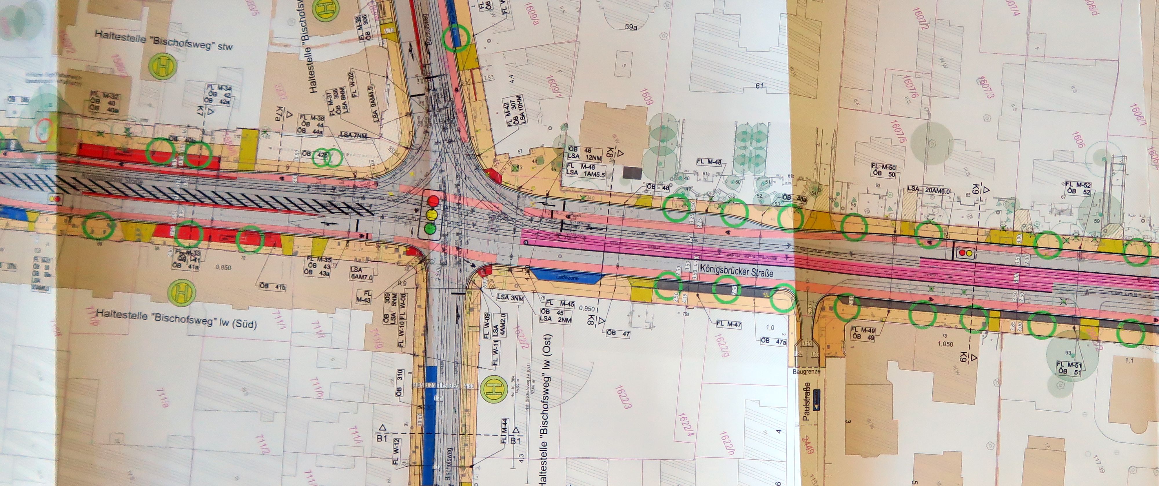 Eine weitere Überraschung hatte der Amtsleiter bzgl. der Kreuzung am Bischofsweg im Gepäck. Derzeit prüfe man, wie künftig auch der Radverkehr von Ost nach West über den Bischofsweg sicher geführt werden könne. In einer ersten Skizze sind Radfahrstreifen zu erkennen. Der Allgemeine Deutsche Fahrrad-Club (ADFC) hatte dies in den vergangenen Tagen mit Demo und Petition gefordert.