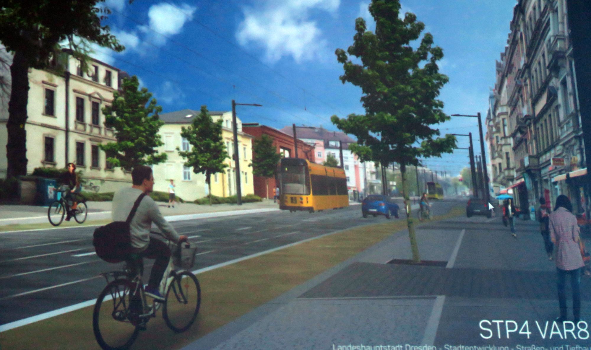 Eine kleine Überraschung war der „Eschenplatz“ – dort verläuft jetzt die sogenannte kleine Königsbrücker vor dem Radladen und „Hole of Fame“, künftig könne dort ein urbaner Platz entstehen, so Koettnitz. Allerdings möchten die Dresdner Verkehrsbetriebe an dieser Stelle gern eine unterirdische Gleichrichtungsanlage einrichten. Derzeit werde geprüft, ob die evtl. auch am Bischofsplatz entstehen könne.