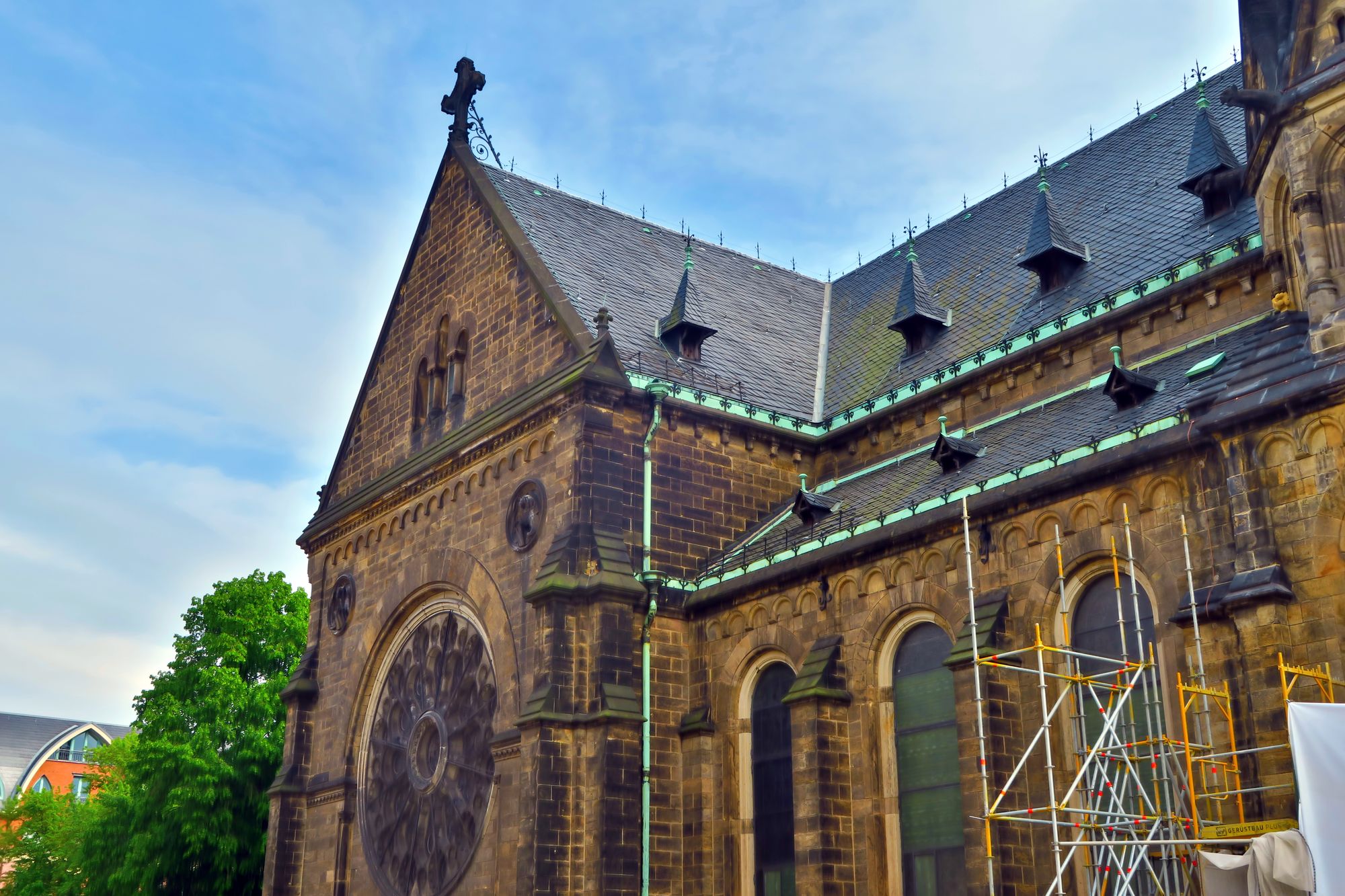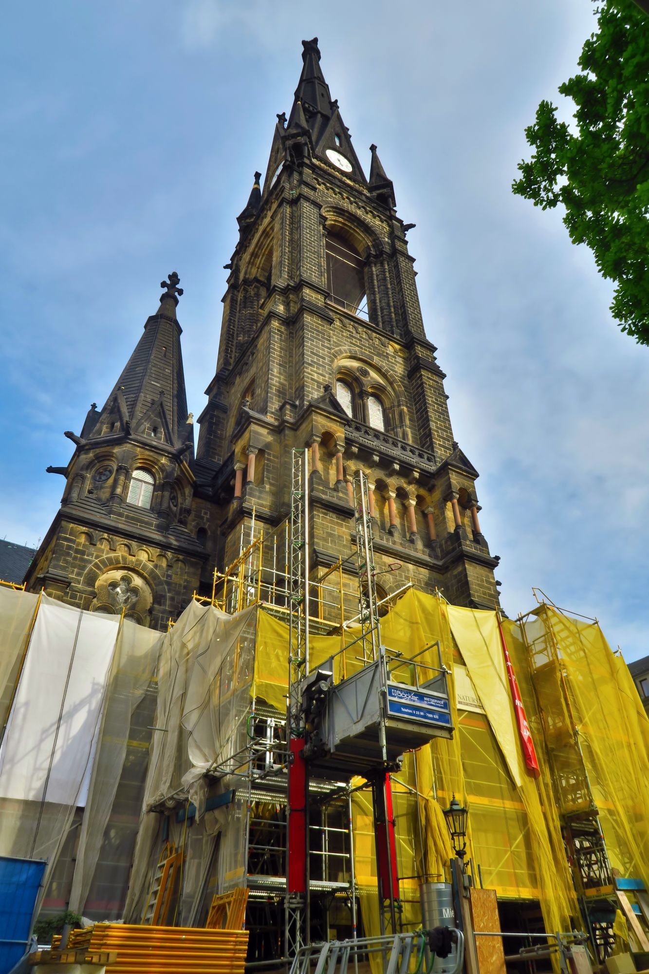 Zum Gerüst: das heißt nun also etwa die halben Baukosten nach ursprünglicher Planung – damit rechnete ich auch. Ich fragte mich schon länger, ob es nicht auch anders gehen kann. Man muß zwar überall rankommen, aber so wahnsinnig viel wurde ja nun auch nicht ausgetauscht bzw. repariert. Industriekletterer und Hebebühne ging sicher nicht, das hatte die Planung vermutlich auch so feststellen müssen. Vielleicht wäre ein Kran denkbar – lediglich als Halter einer Arbeitsbühne? Im Übrigen: an der Herz-Jesu-Kirche schien das Ganze wesentlich unkomplizierter über die Bühne zu gehen…