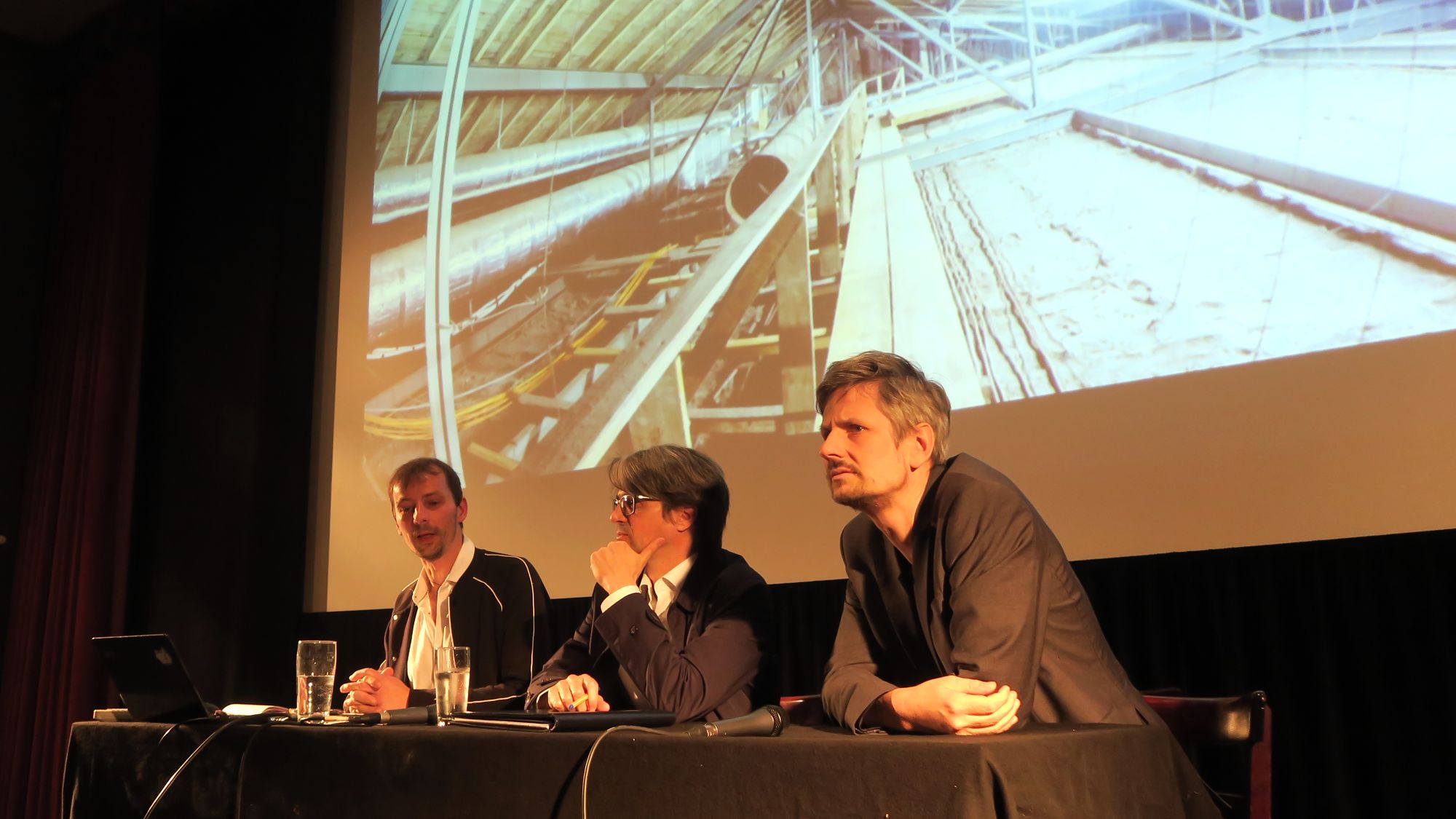 Schauburg-Chef Stefan Ostertag und die Architekten Benjamin Grill und Hendrik Neumann (v.l.) im Fritz-Lang-Saal.
