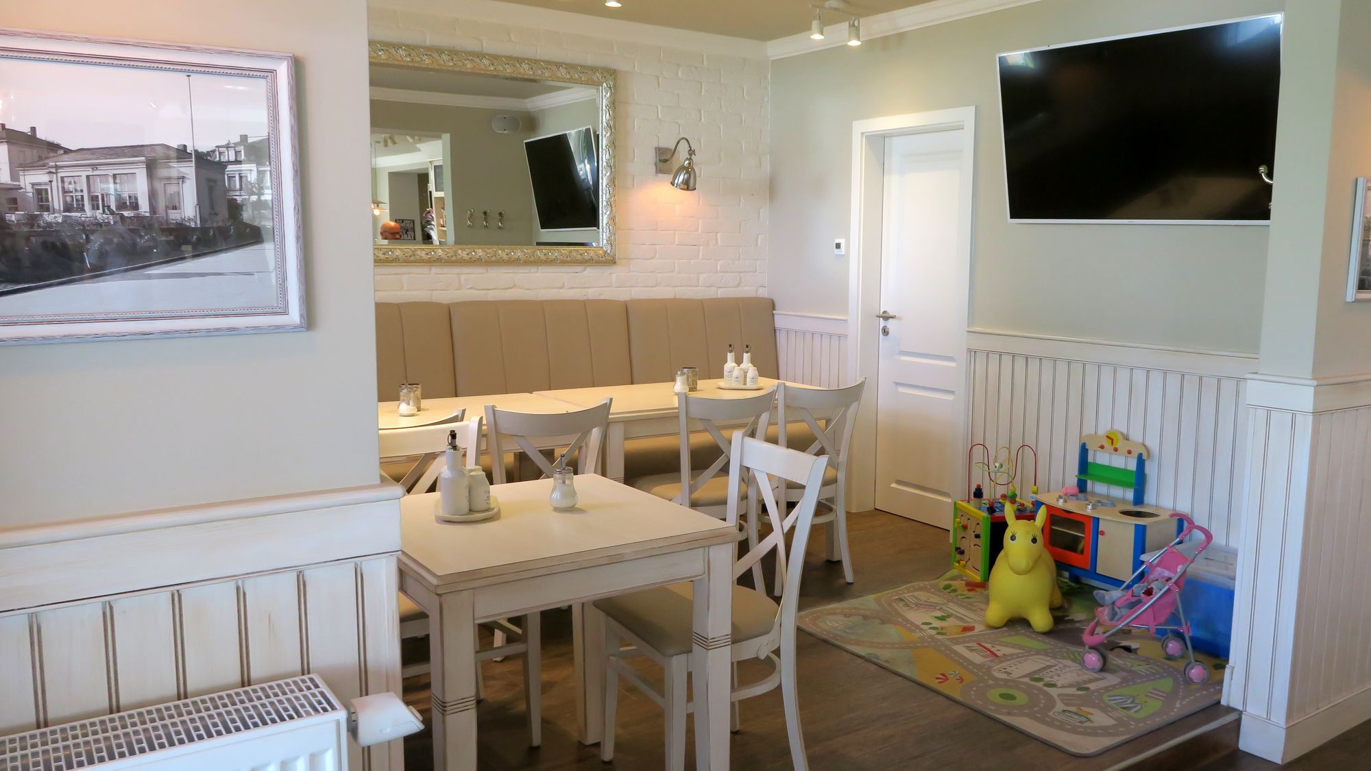 Die Gasträume wurden gründlich umgestaltet und sind in mehrere Bereiche und Terrassen gegliedert. Eine weiße Holztäfelung, helles Mobiliar und ein imposanter Zinn-Tresen zeichnen die lichte Atmosphäre in der Brasserie im Erdgeschoss aus. Hier gibt es eine Kinderspielecke und für größere Spielefans einen Fernseher und natürlich die Eistruhe, „der einzige Gegenstand, der die Renovierung überlebt hat“, scherzt Mirco Meinel. Das Eis wird in einer kleinen Werkstatt in unmittelbarer Nähe exklusiv für das Café hergestellt.