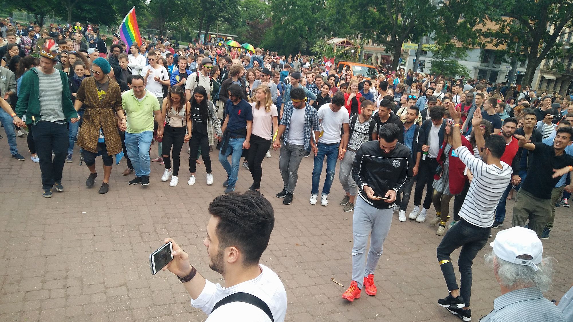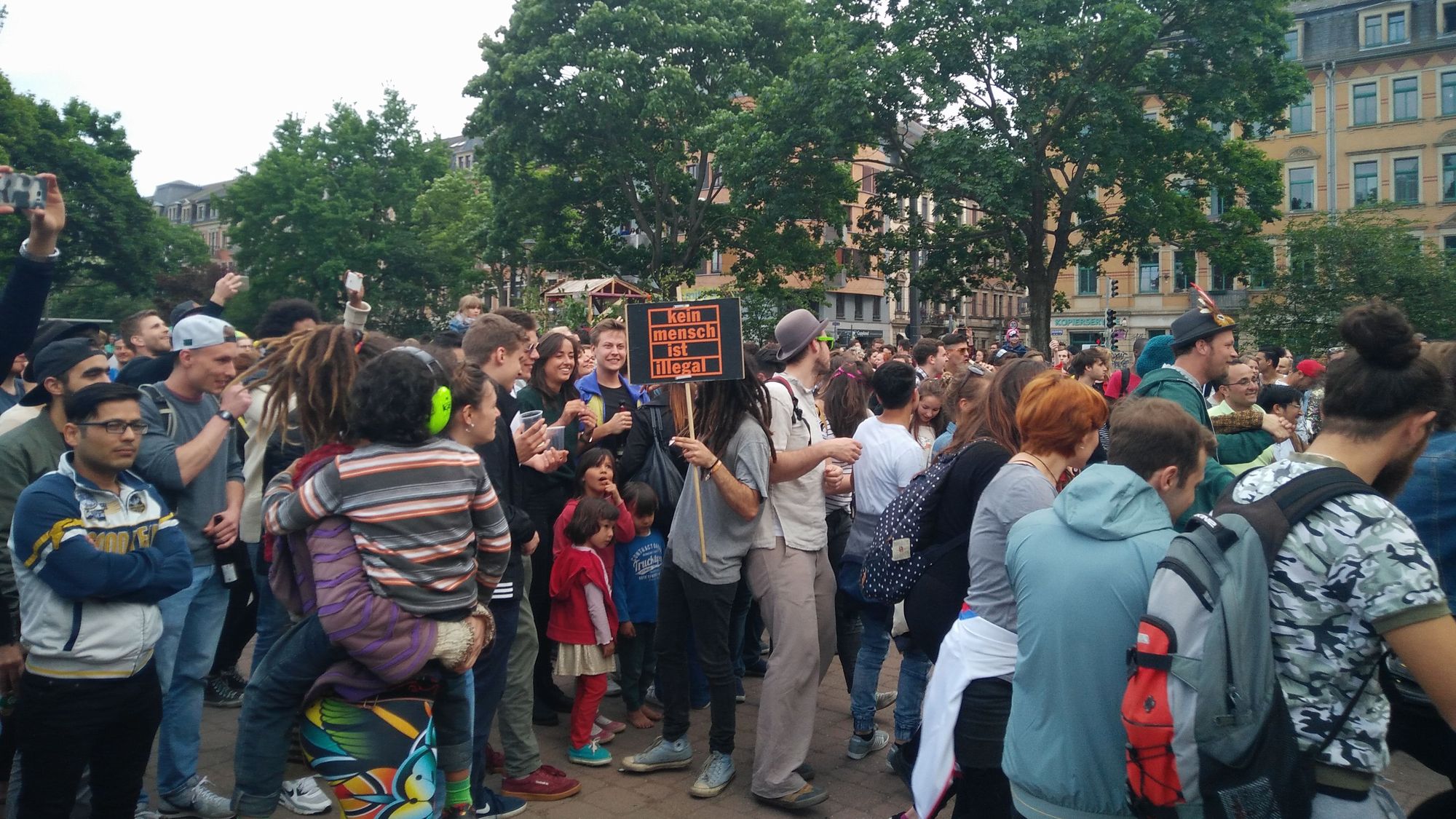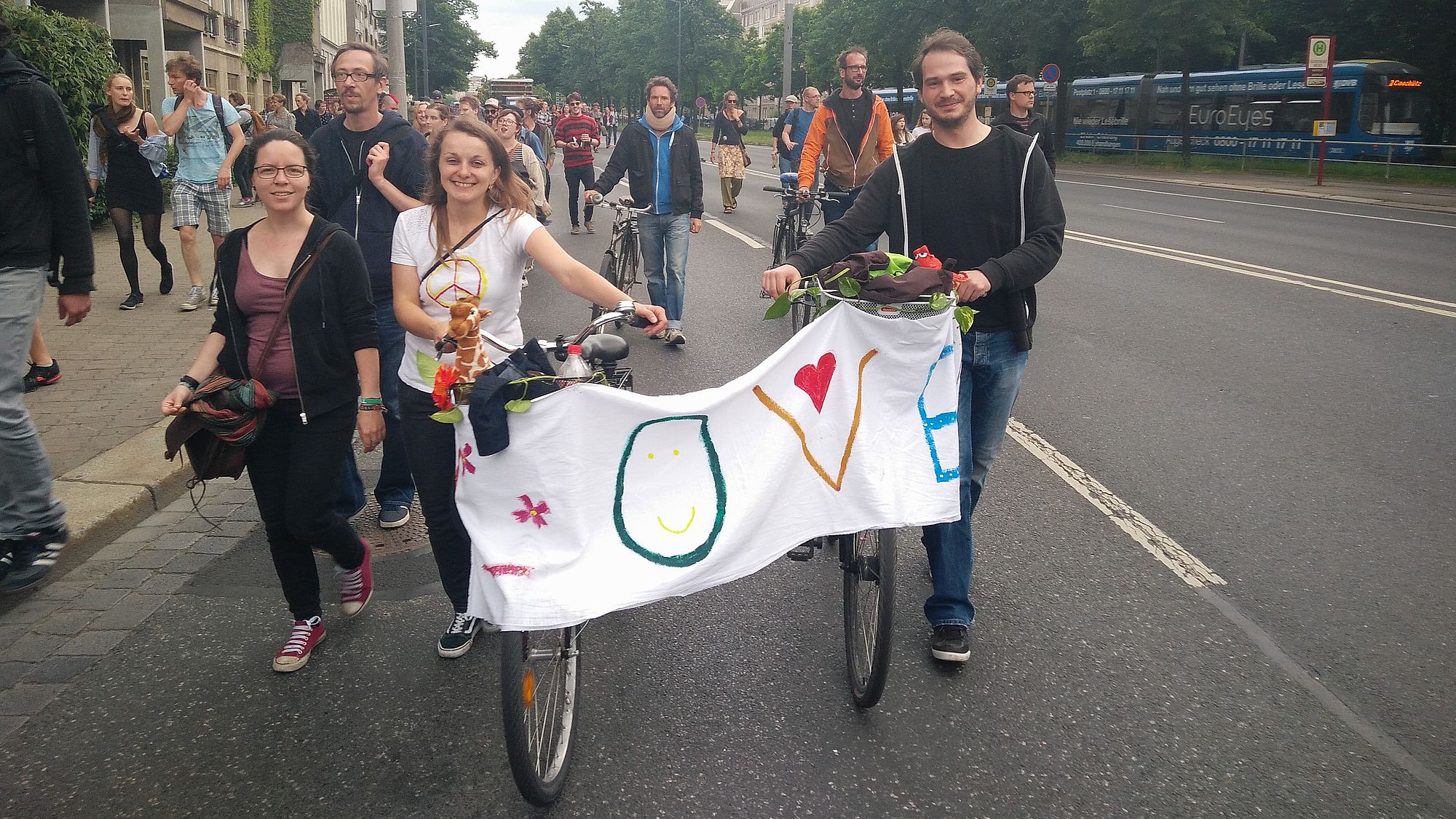 Unser Führungsfahrzeug war von Refugees gestaltet … Wir haben im Alaunpark zu orientalischer Musik mit 300 Menschen Dabke, einen syrischen Tanz, getanzt – epische Szenen. Wir produzieren Bilder, wie sie Dresden dringend braucht. Weltoffenheit, Toleranz, Empathie …